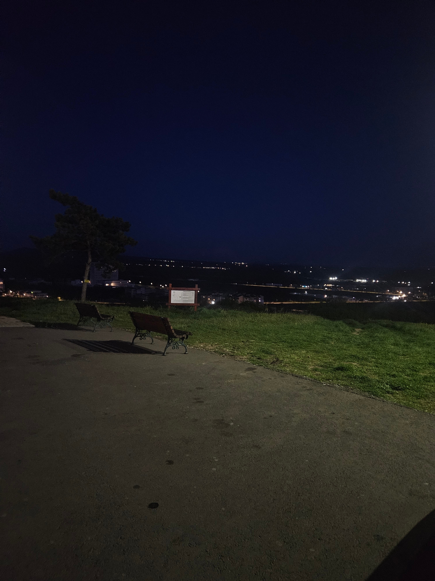 The image depicts a nighttime scene along a path in Yambol, Bulgaria. A paved walkway borders a grassy area. Several benches are situated near a park sign, with trees nearby. Streetlights are visible…read more