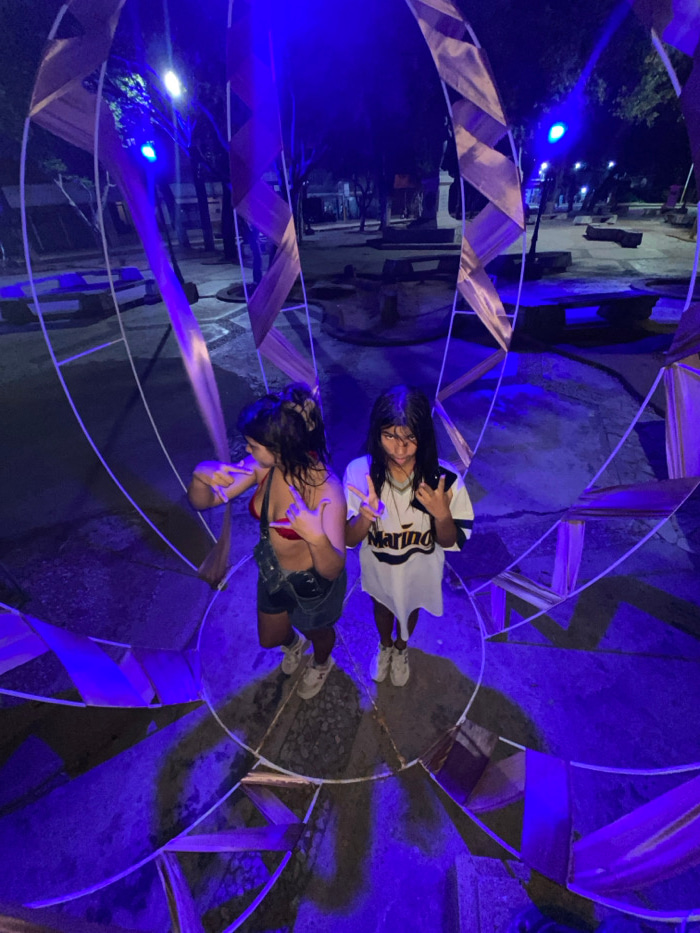 Two women stand inside a circular structure with fabric and blue lighting. One woman wears a white t-shirt and glasses, making a peace sign with her left hand. The other wears a red top and denim shor…read more