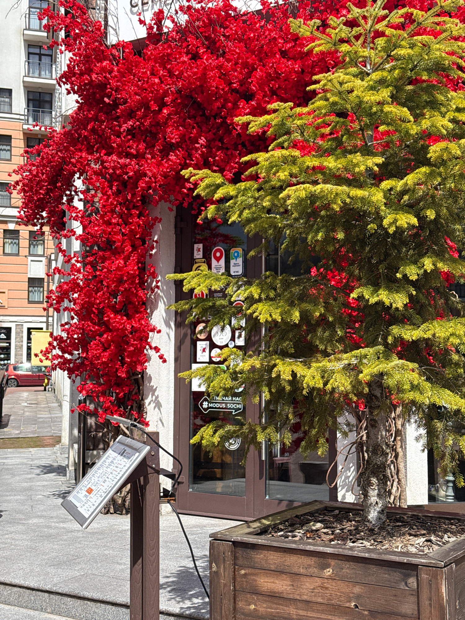 The image shows the entrance to a building in Estosadok, Russia. The entrance is framed by a vibrant display of red and green foliage, which appears to be artificial. The green foliage is on the right…read more