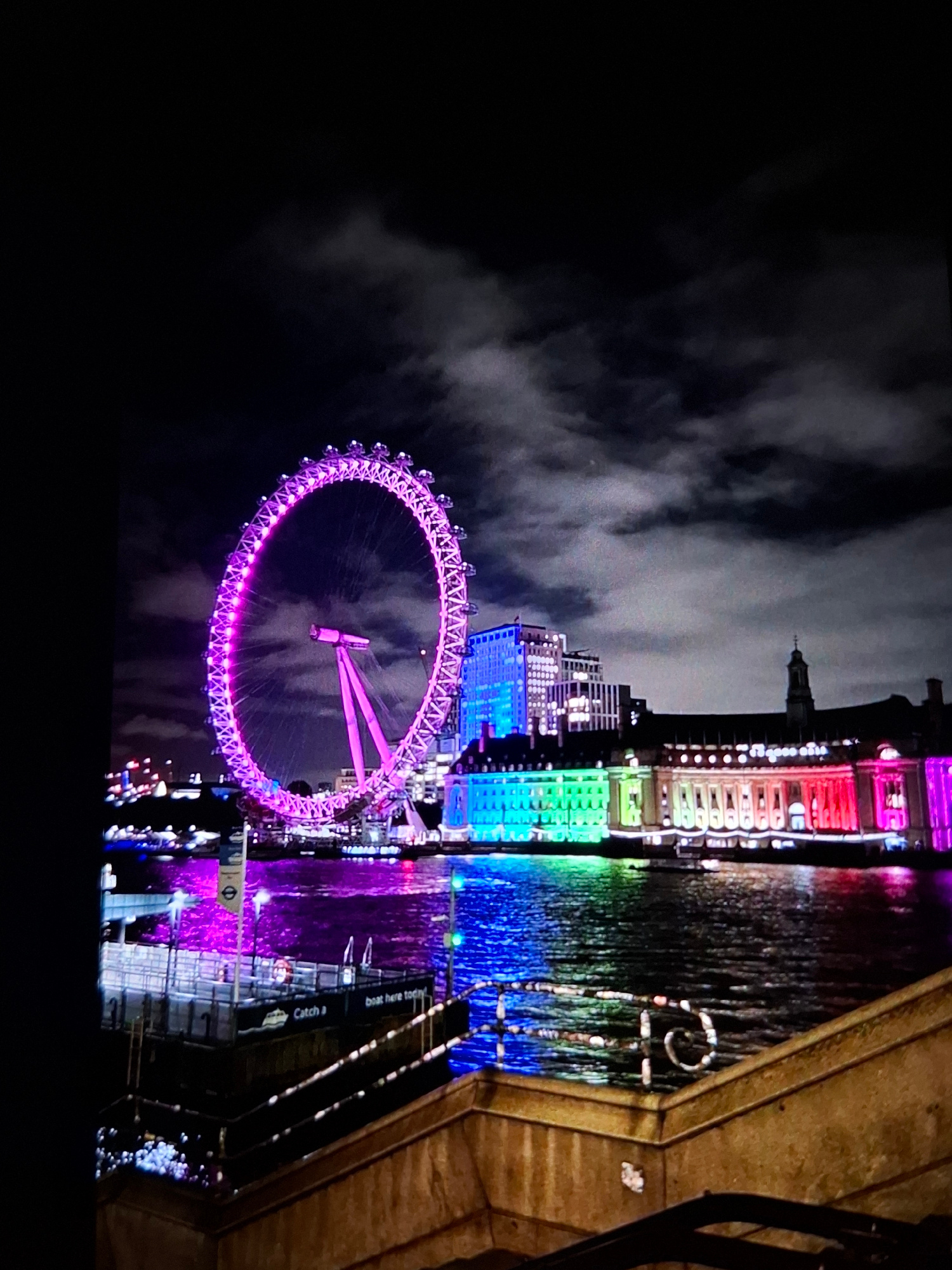 The image, rotated 90 degrees counter-clockwise, displays a vibrant night scene along a body of water, strongly resembling the River Thames in London, UK, despite the provided context of Burgas, Bulga…read more