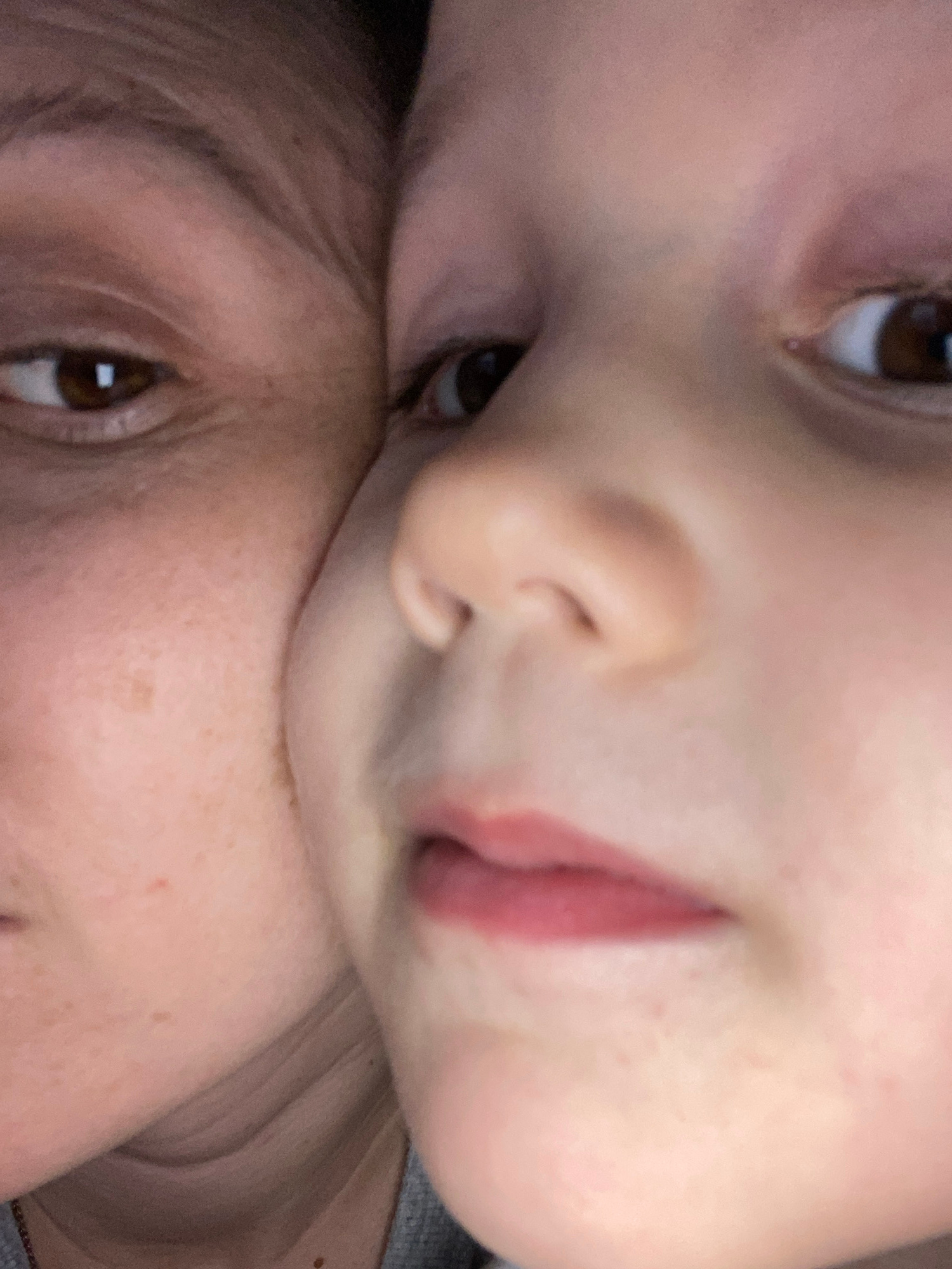The image shows a close-up view of two individuals. The top individual is a young child with fair skin, brown eyes, a small nose, and pink lips. The bottom individual is another person, also with fair…read more