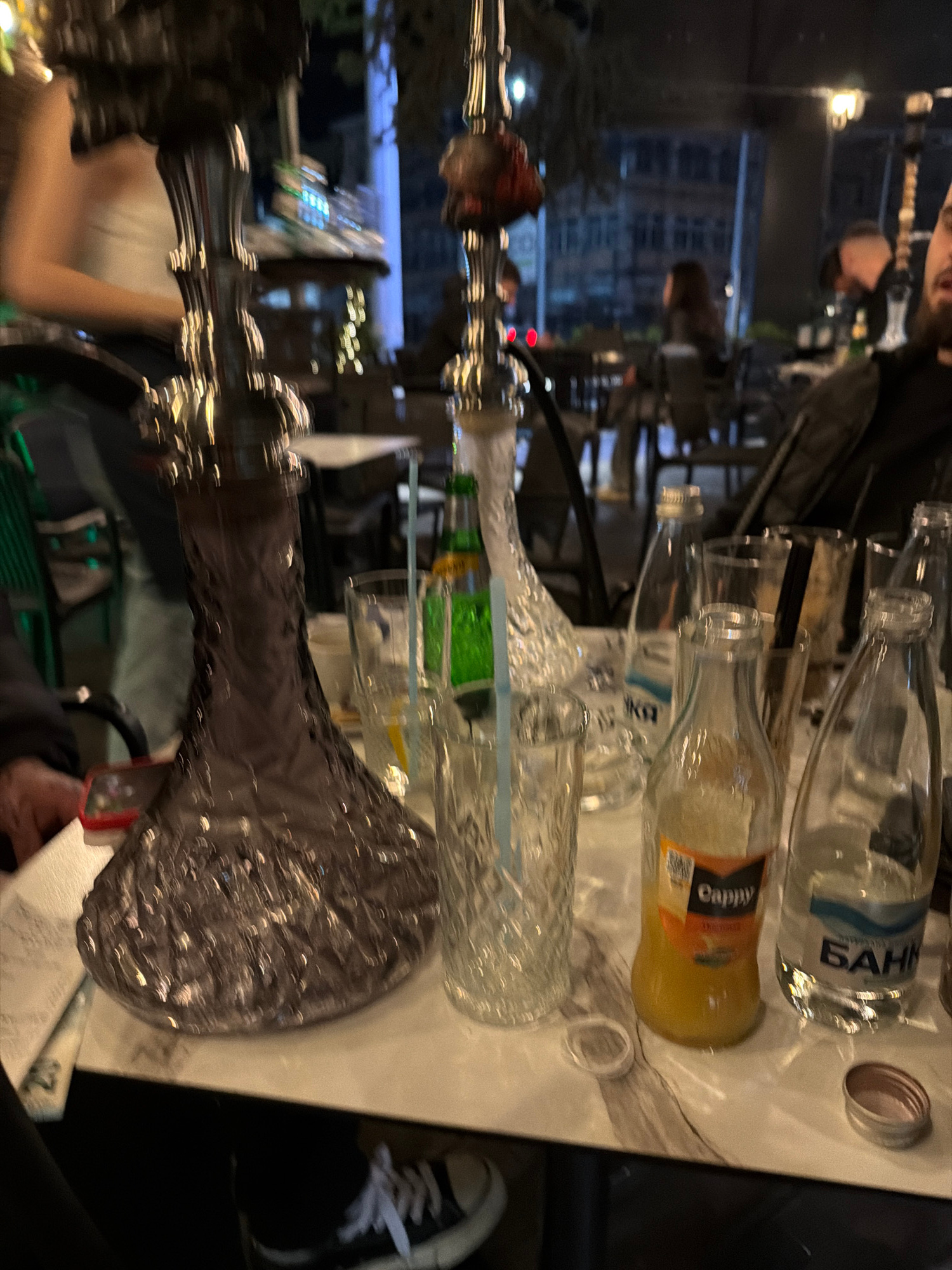 The image captures a table scene, presumably at a café or restaurant, located in Unknown, Unknown. The composition features a hookah as the focal point, with its silver-toned base prominently displaye…read more