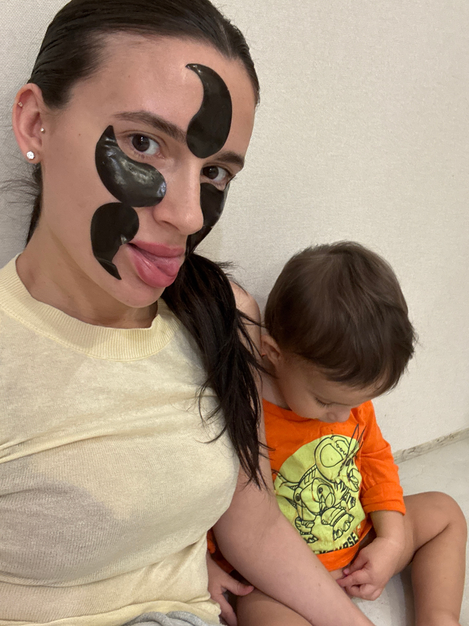A woman with dark hair is lying on a light-colored surface, possibly a bed or couch. She has black cosmetic eye and lip masks on her face. A young child wearing an orange t-shirt with a cartoon graphi…read more