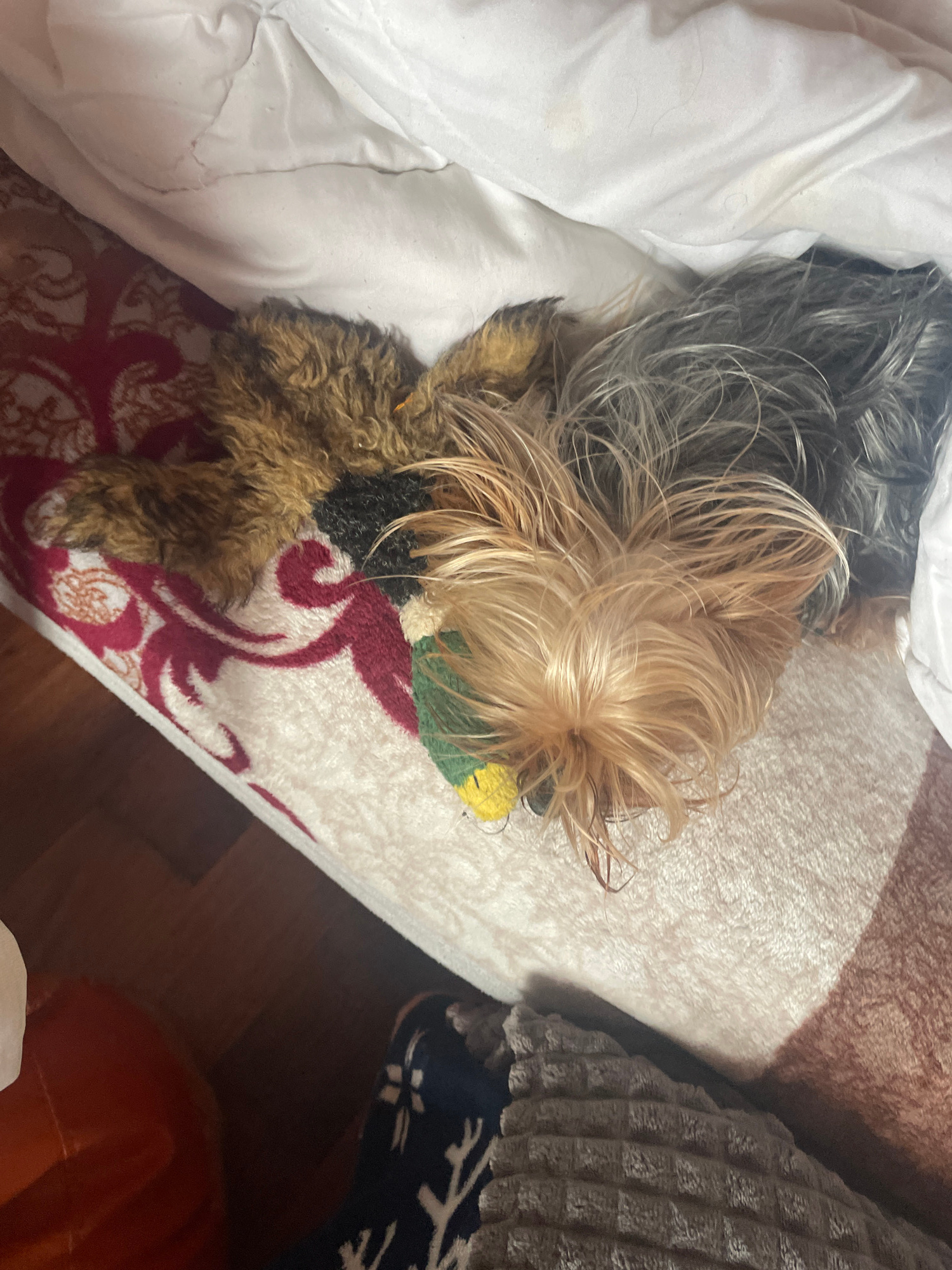 A brown and gray Yorkshire Terrier lies on a bed. The dog rests atop a white blanket with a red and white floral pattern near the bottom of the frame. A soft, cream-colored blanket is draped to the ri…read more