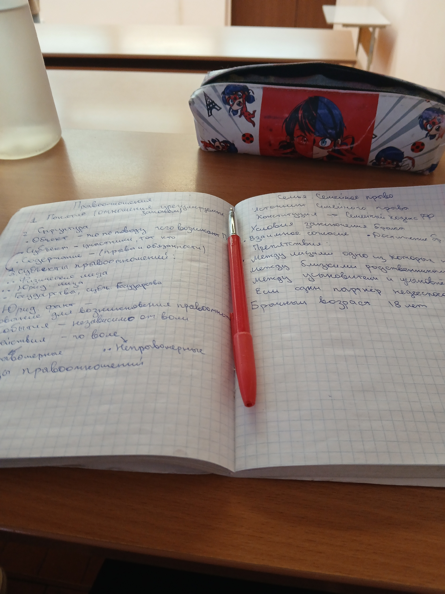 The image shows a notebook lying open on a table, with a red pen resting in the middle. The notebook pages are filled with handwritten notes in Russian on the subjects of family law and legal relation…read more