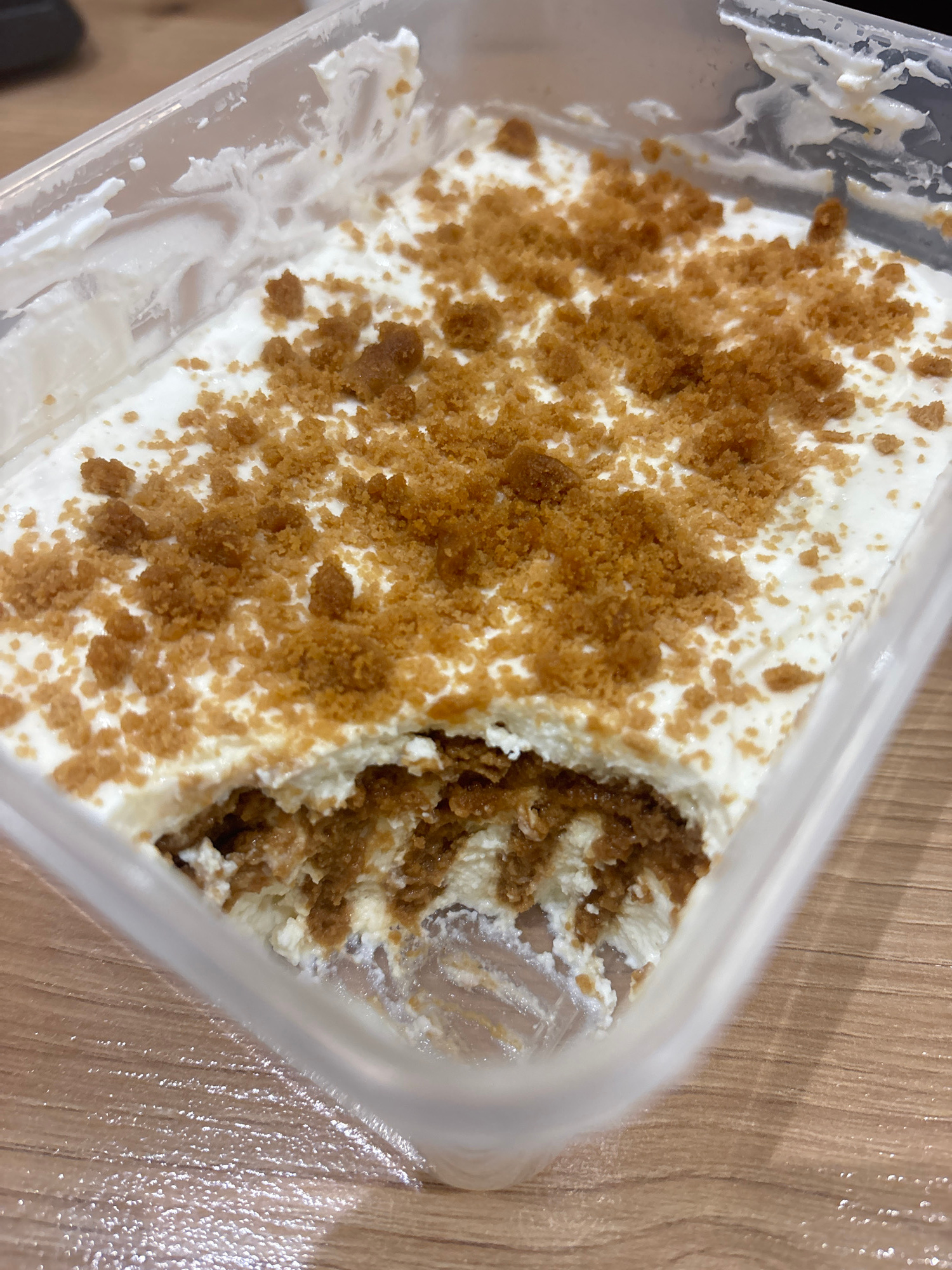 A partially-eaten dessert, possibly tiramisu or a similar layered treat, is contained within a clear plastic rectangular container. The dessert consists of a white creamy base, topped with a layer of…read more