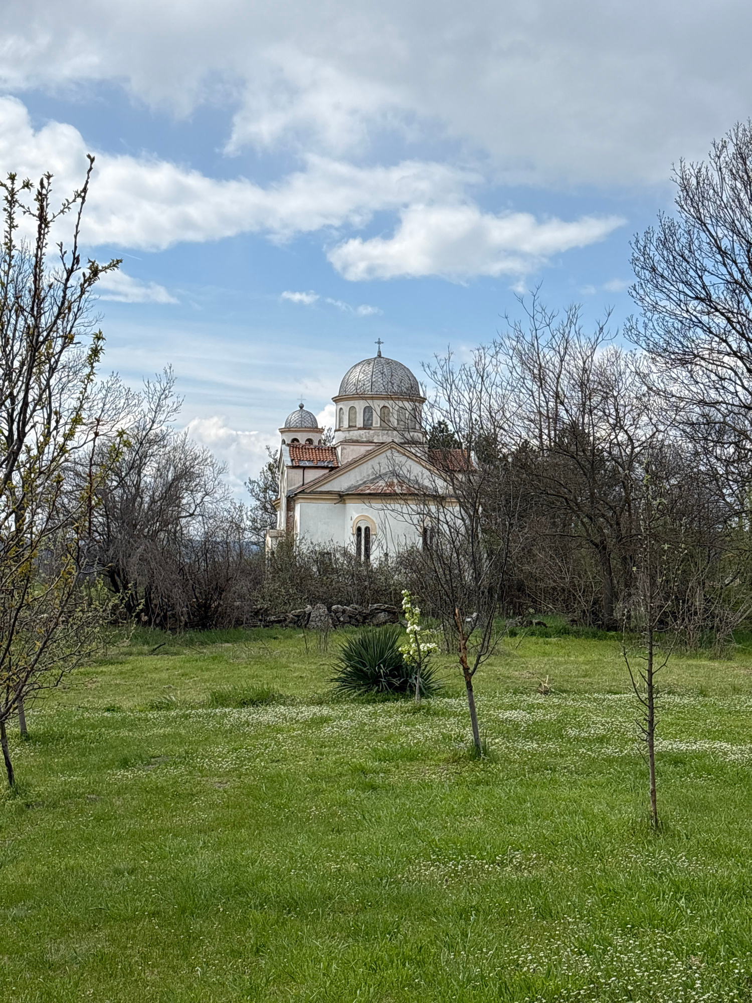 The image shows a white Orthodox church with two domes in Rabrovo, Bulgaria. The domes are gray with a black cross on top. The church is surrounded by green grass with small white flowers. Some bare t…read more