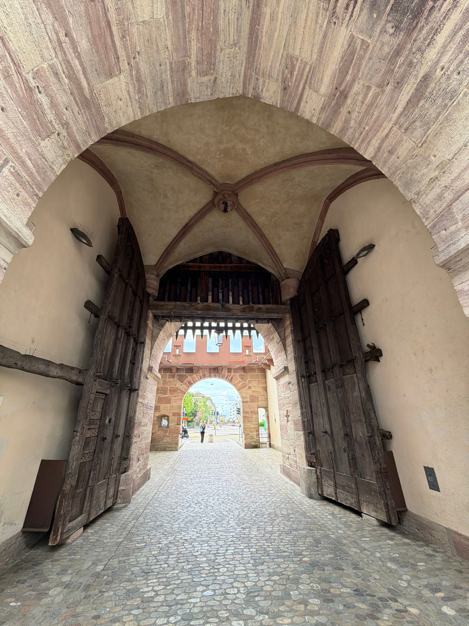 The image presents a view from inside a historical stone archway or gate, looking outwards towards a street scene. The immediate foreground features a massive, ancient arch constructed from light-colo…read more