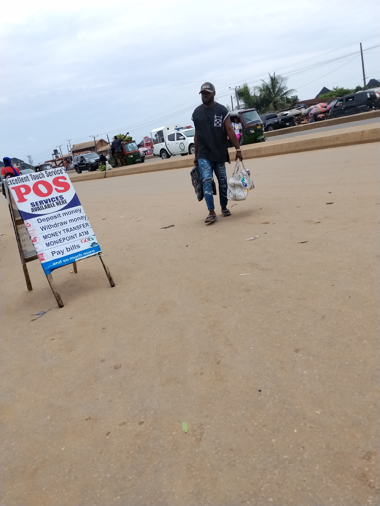 The image captures a street scene in Ura Nta Umuarandu, Nigeria. The location appears to be a roadside, possibly a commercial area, evidenced by vehicles, including trucks and a medical response vehic…read more