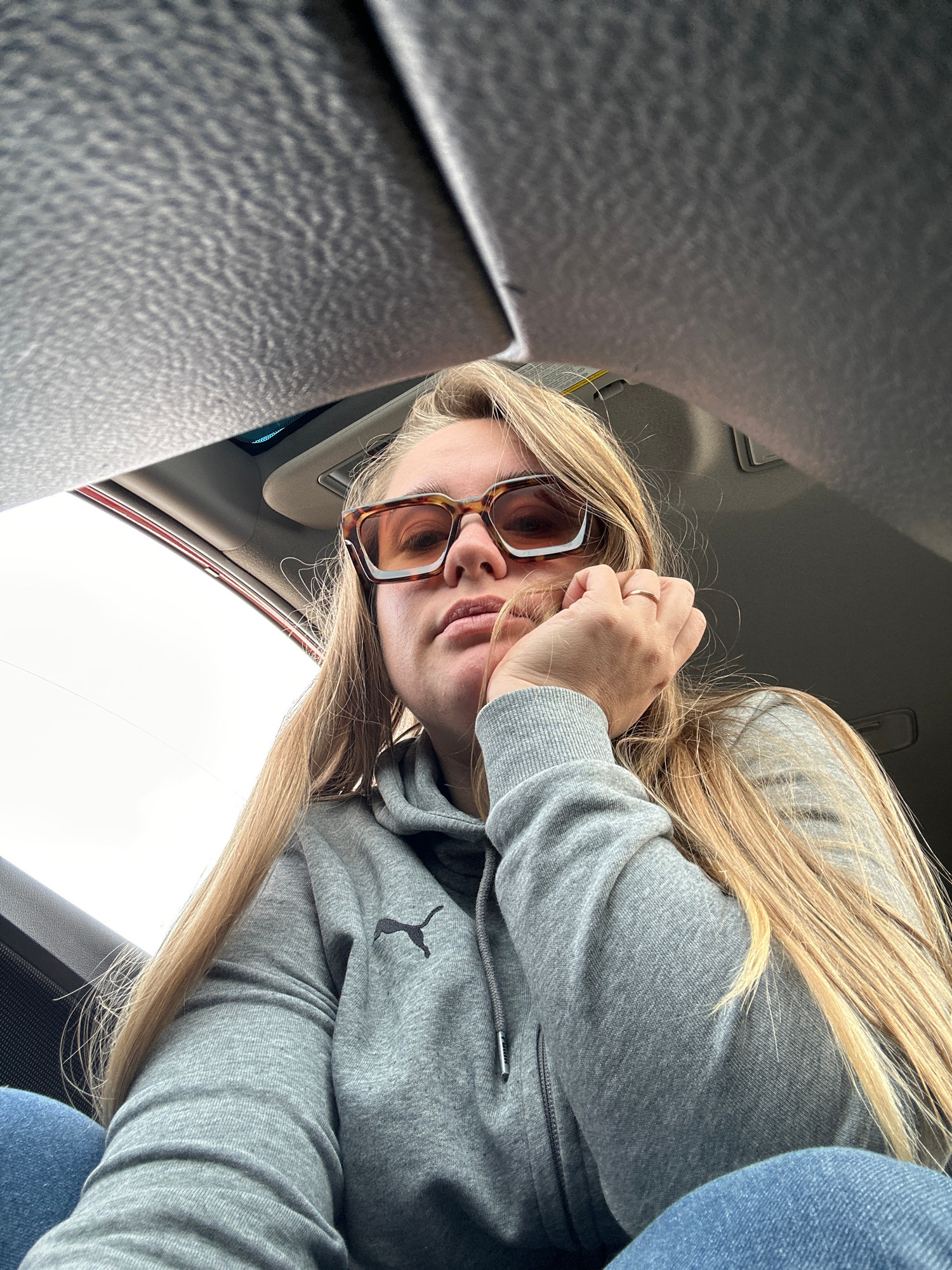 A woman with long blonde hair and sunglasses is seated in a car. She is wearing a grey Puma hoodie and blue jeans. Her hand is near her face, and she is wearing a ring on her finger. The car's interio…read more