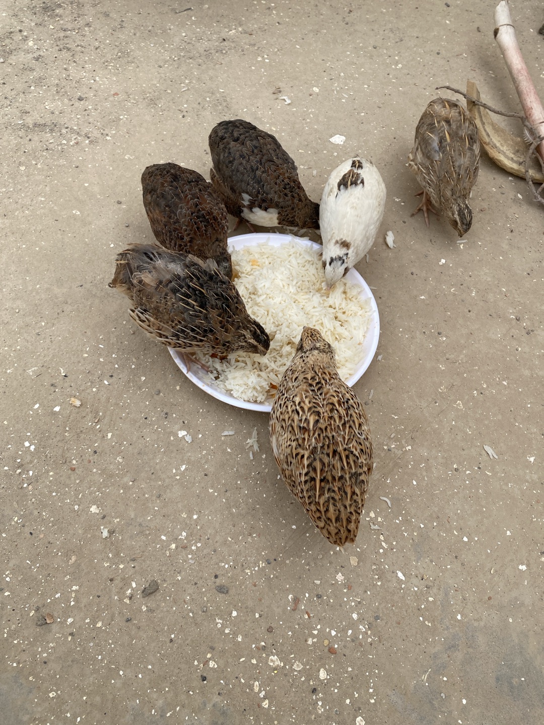 The image shows six quails gathered around a white plastic plate filled with cooked white rice. The birds are of varying colors and patterns: brown, speckled, and one primarily white with brown markin…read more