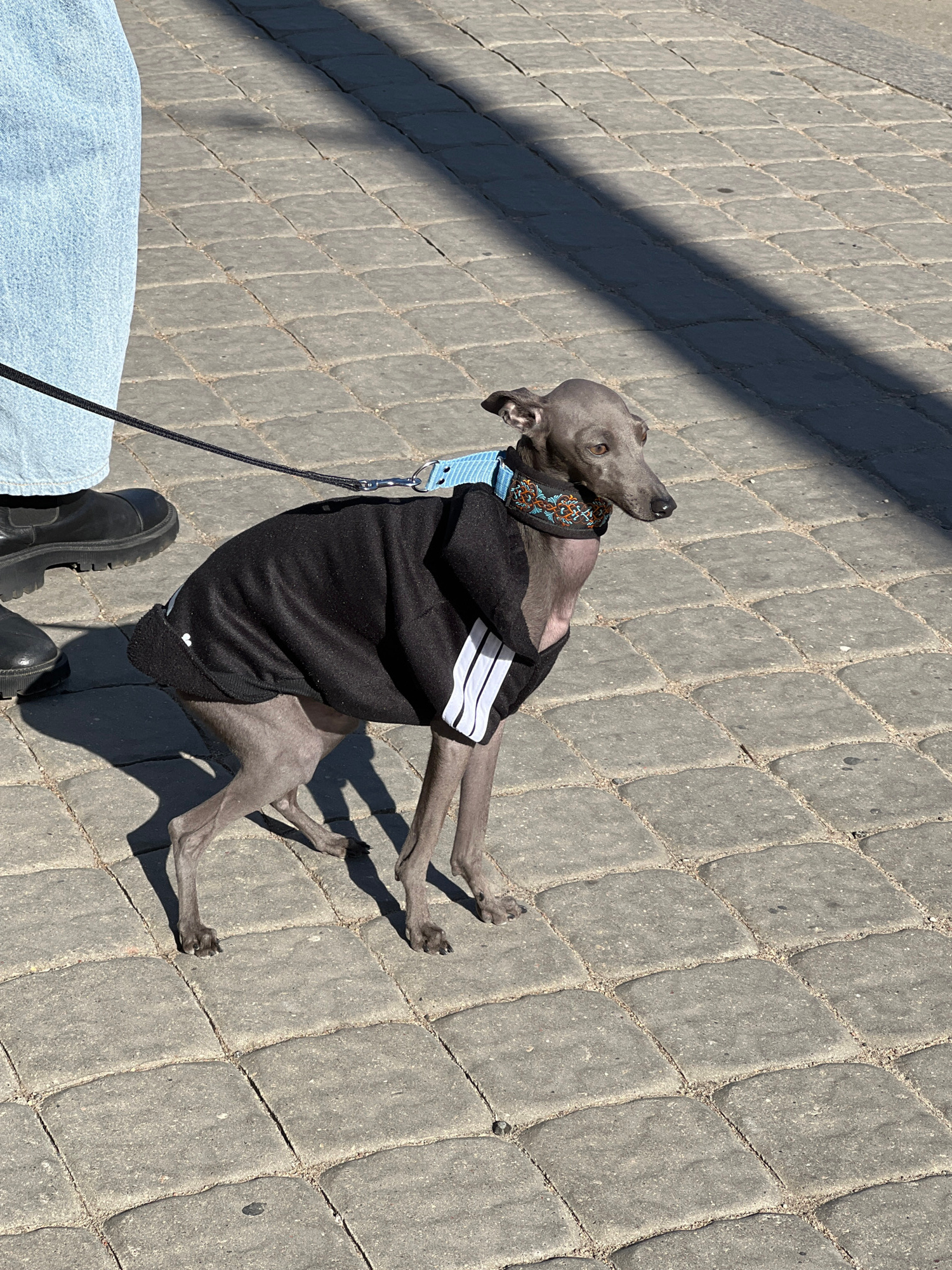 A small, grey Italian Greyhound dog wearing a black jacket with white stripes lies prone on a grey stone-paved surface, likely a pedestrian walkway. The dog wears a blue and patterned collar and is at…read more
