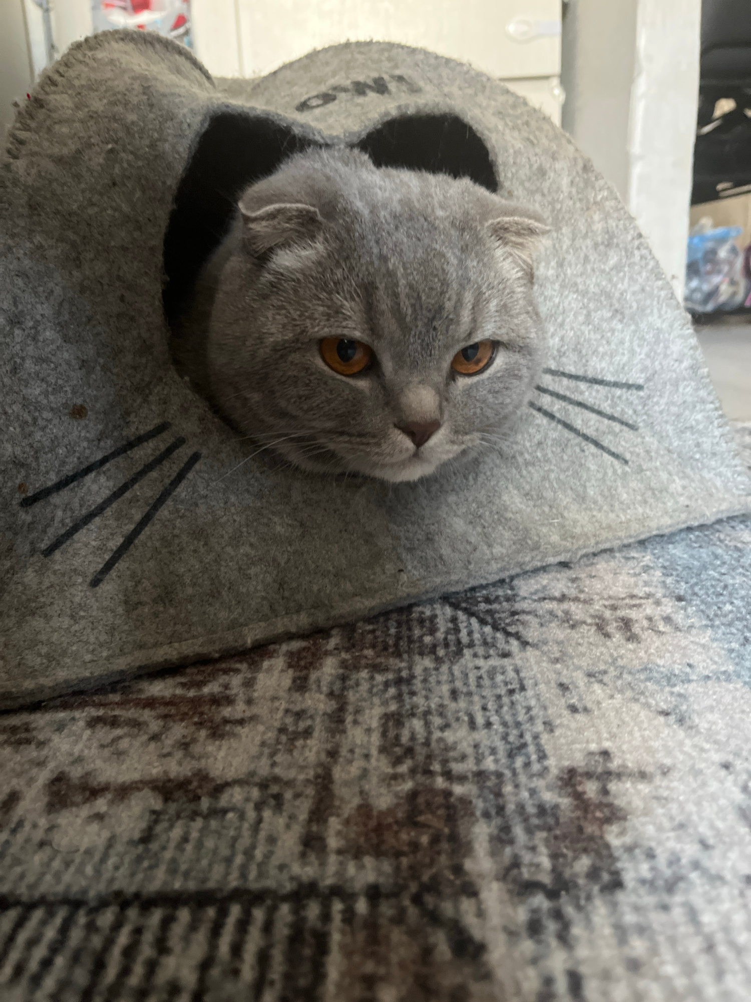 A gray Scottish Fold cat is sitting inside a gray, felted cat bed. The cat bed has a hole on one side through which the cat's head is protruding. The cat is looking towards the upper right corner of t…read more