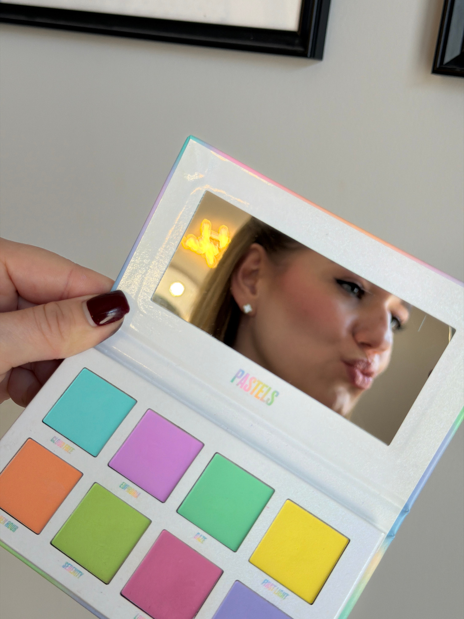 A hand with a dark red fingernail holds a pastel-colored eyeshadow palette open, reflecting a face with pursed lips in the mirror. The palette has a grid of square eyeshadows in shades of yellow, greeβ¦read more