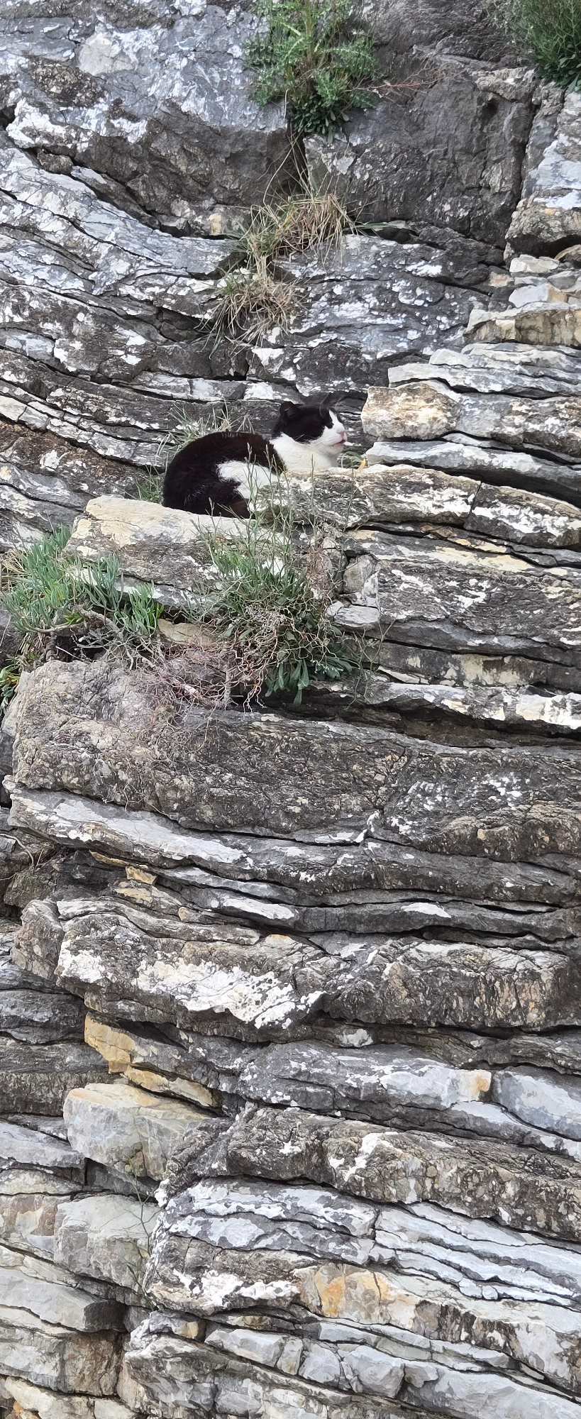 A black and white goat stands between layers of a cliffside rock face in Budva, Montenegro. The rock face is weathered, with many cracks and crevices, and small patches of vegetation growing out of it…read more