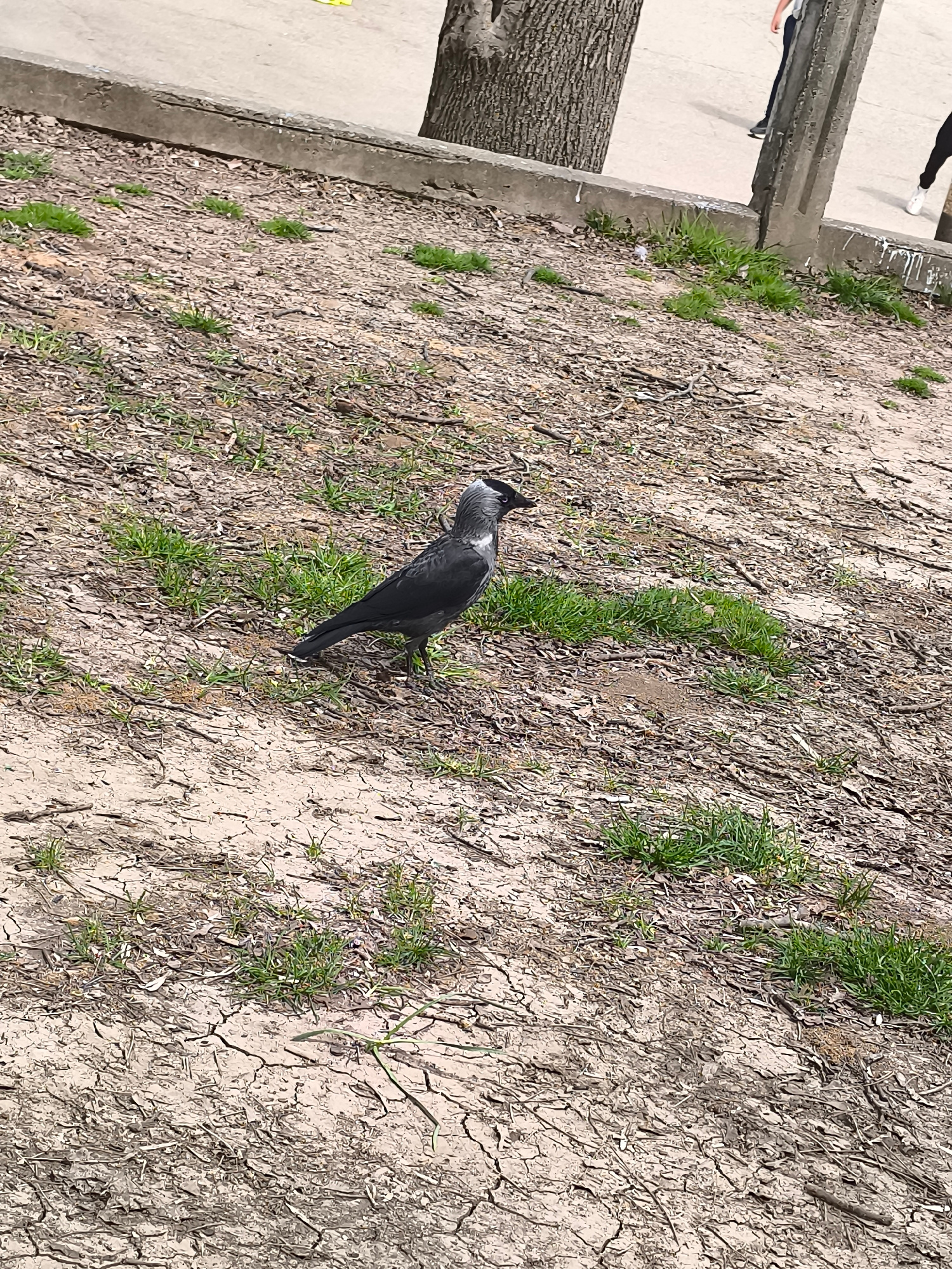 The image shows a Western Jackdaw bird standing on cracked soil with sparse patches of green grass. The bird is dark gray with a lighter gray head. The soil is dry and cracked, with small twigs and le…read more