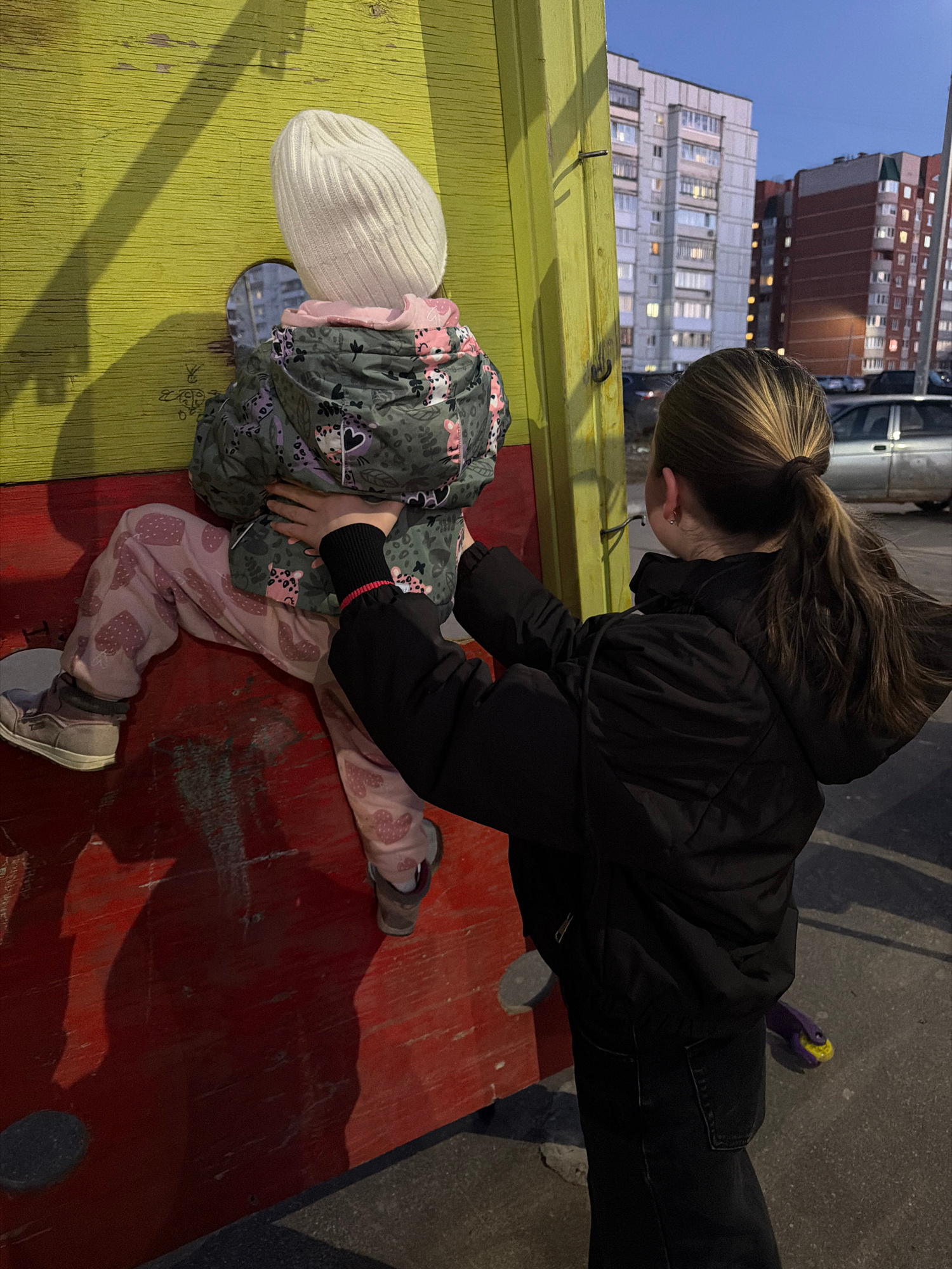 A child is in a wooden pillory, with their head through a hole on the left, and their body on the right. The pillory is painted with a yellow board on the left and red board on the right. An older chi…read more