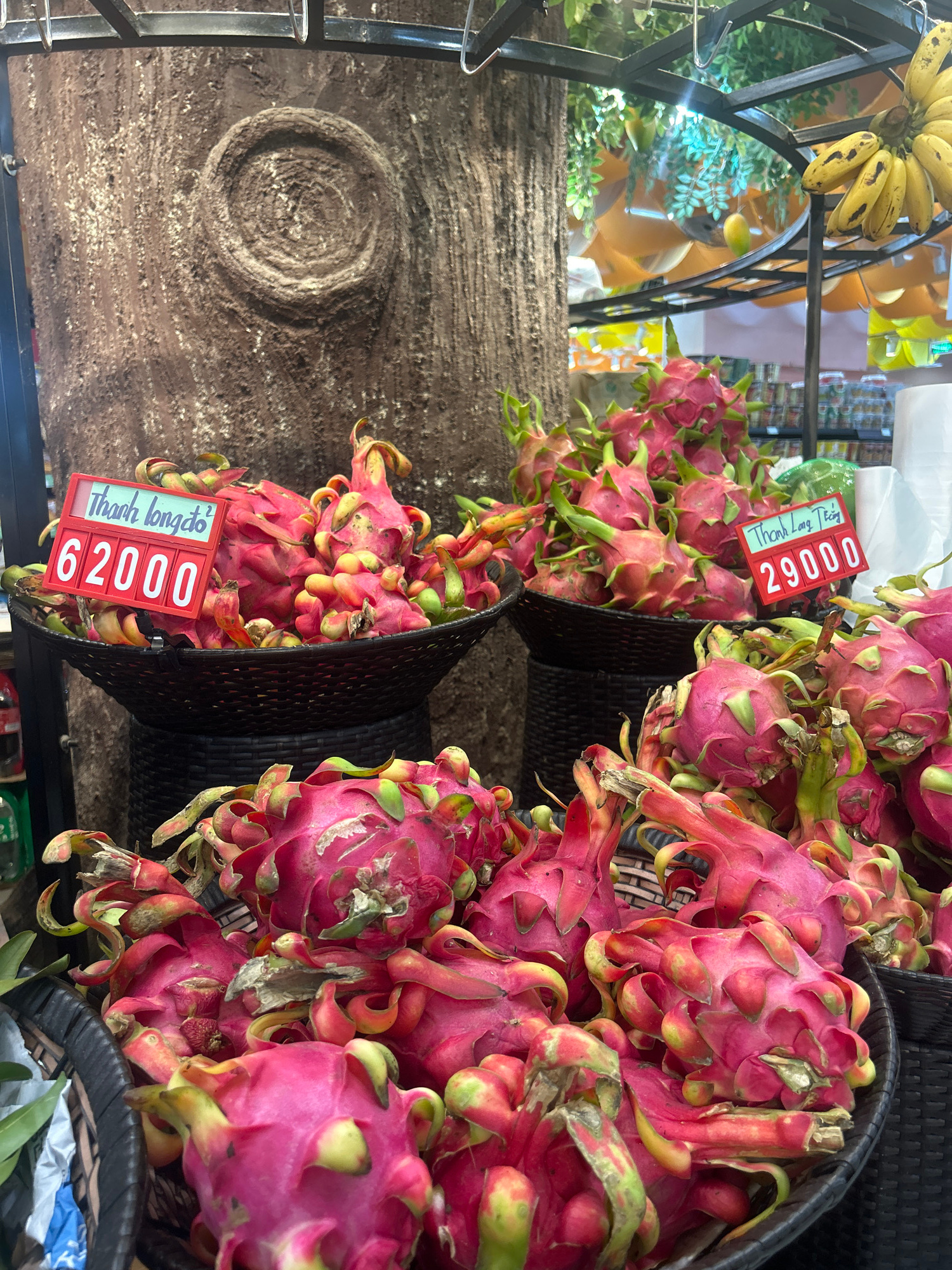 Bắc Nha Trang, Vietnam: Three black woven baskets hold red-skinned dragon fruits, with price signs reading "Thanh Long 29000" and "Thanh Long do 62000". Above, bananas hang from a metal rack. The back…read more
