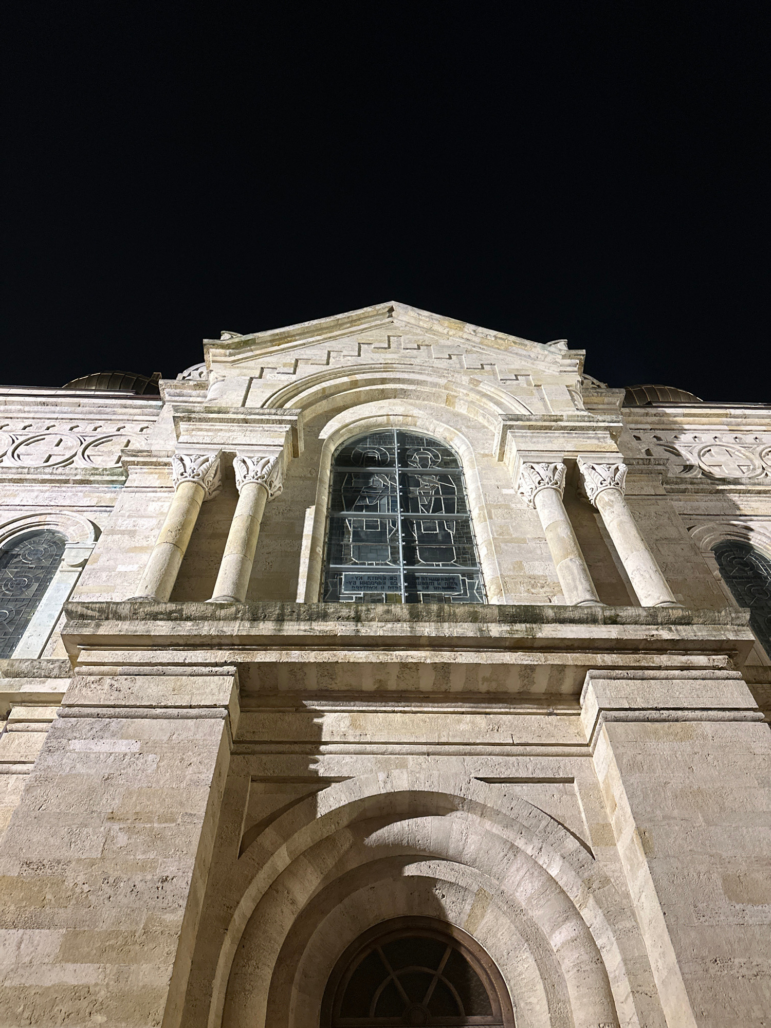 The image depicts a section of a building, specifically the facade of the Dormition of the Mother of God Cathedral in Varna, Bulgaria, taken at night. The architectural style includes light-colored stβ¦read more