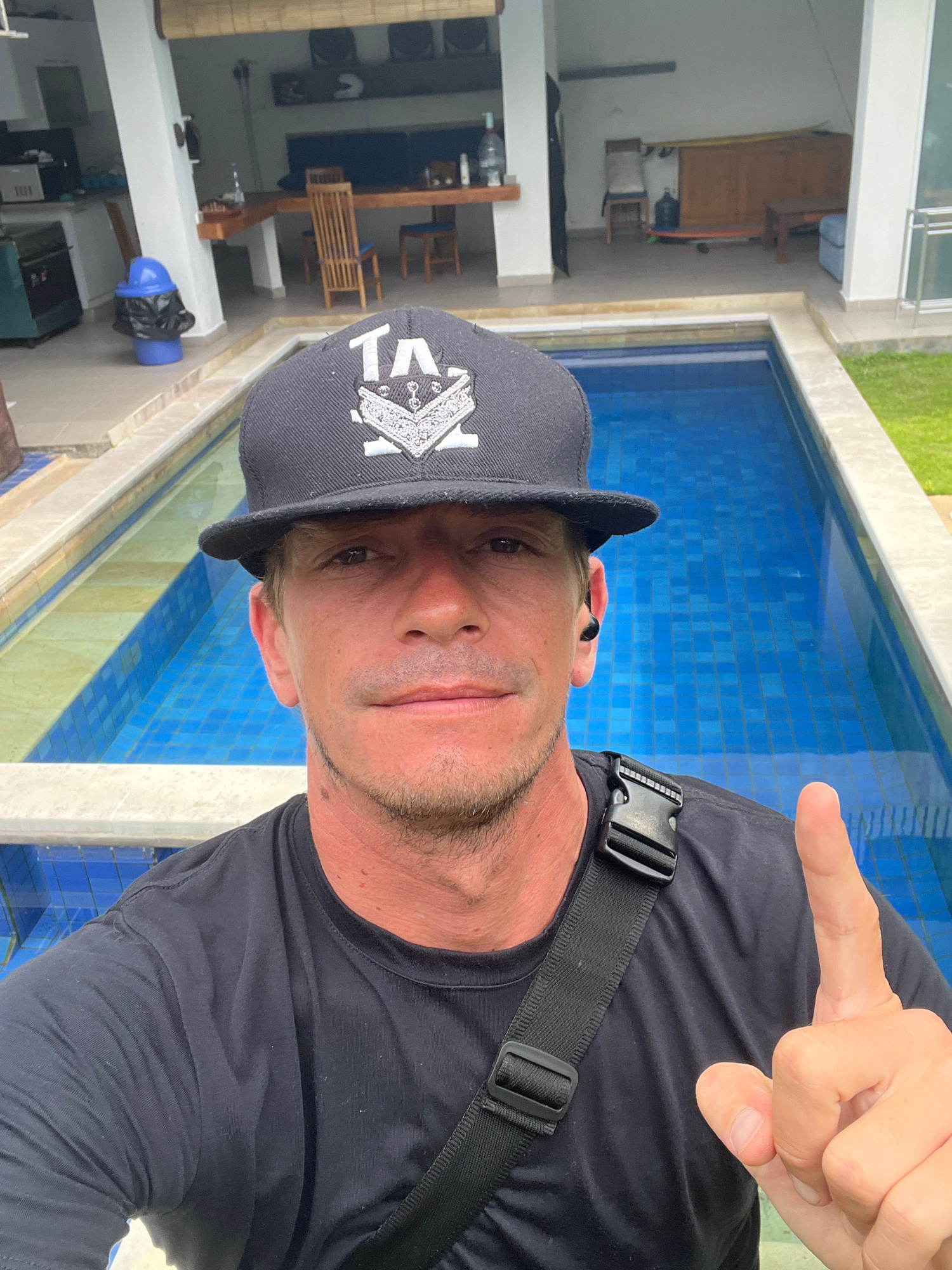A male individual is captured in a mid-shot selfie, positioned outdoors in Pecatu, Indonesia. He has light skin, light stubble on his face, and wears a black t-shirt and a black baseball cap featuring…read more