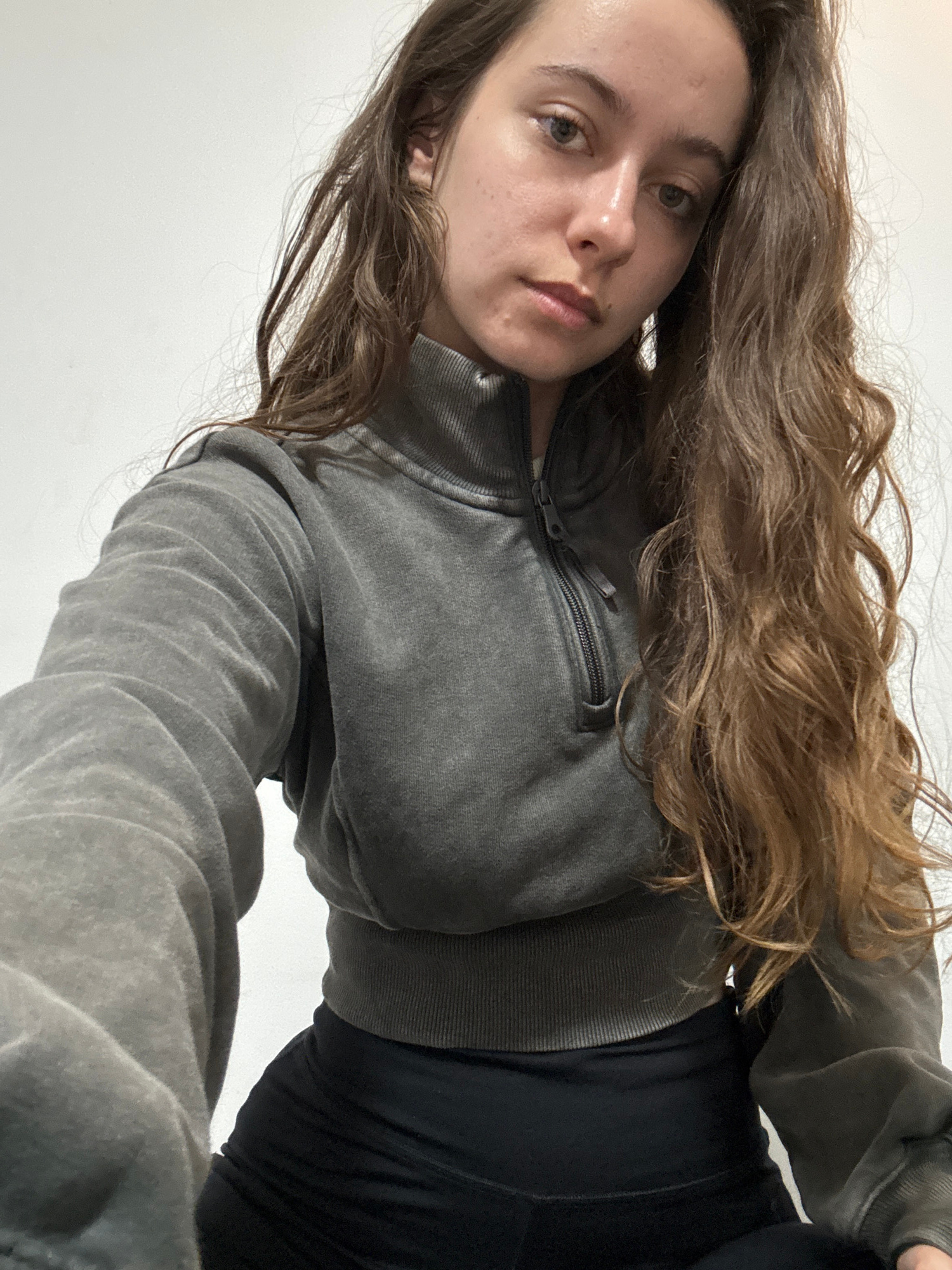 A young woman with long, wavy brown hair is facing the camera. She is wearing a gray, zip-up sweatshirt and black leggings. The background is a plain white wall. It is not possible to ascertain the lo…read more