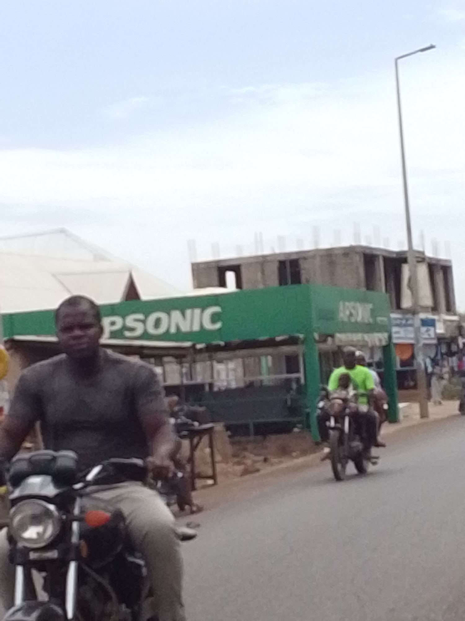 The image depicts a daytime street scene in a commercial area of Tamale, Ghana, likely along a main thoroughfare. The sky is overcast. In the foreground, a dark-skinned male, estimated to be in his 3…read more
