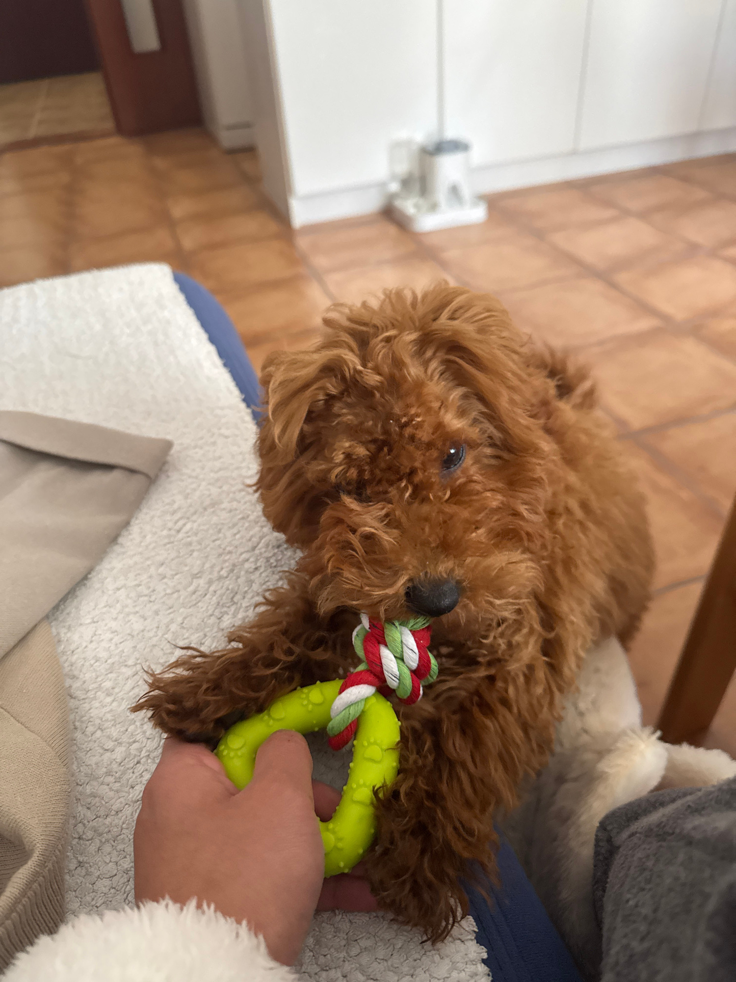 A reddish-brown, curly-haired dog is depicted indoors in Sutomore, Montenegro, engaging in a play interaction. The dog, likely a poodle or similar breed, is positioned centrally, looking towards the v…read more