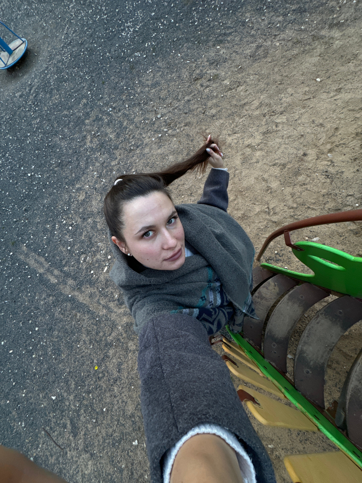 A woman is the main subject, appearing to take a selfie from a low angle, possibly while seated or lying on the ground. She has fair skin, dark hair pulled back in a ponytail, and is wearing a gray ja…read more