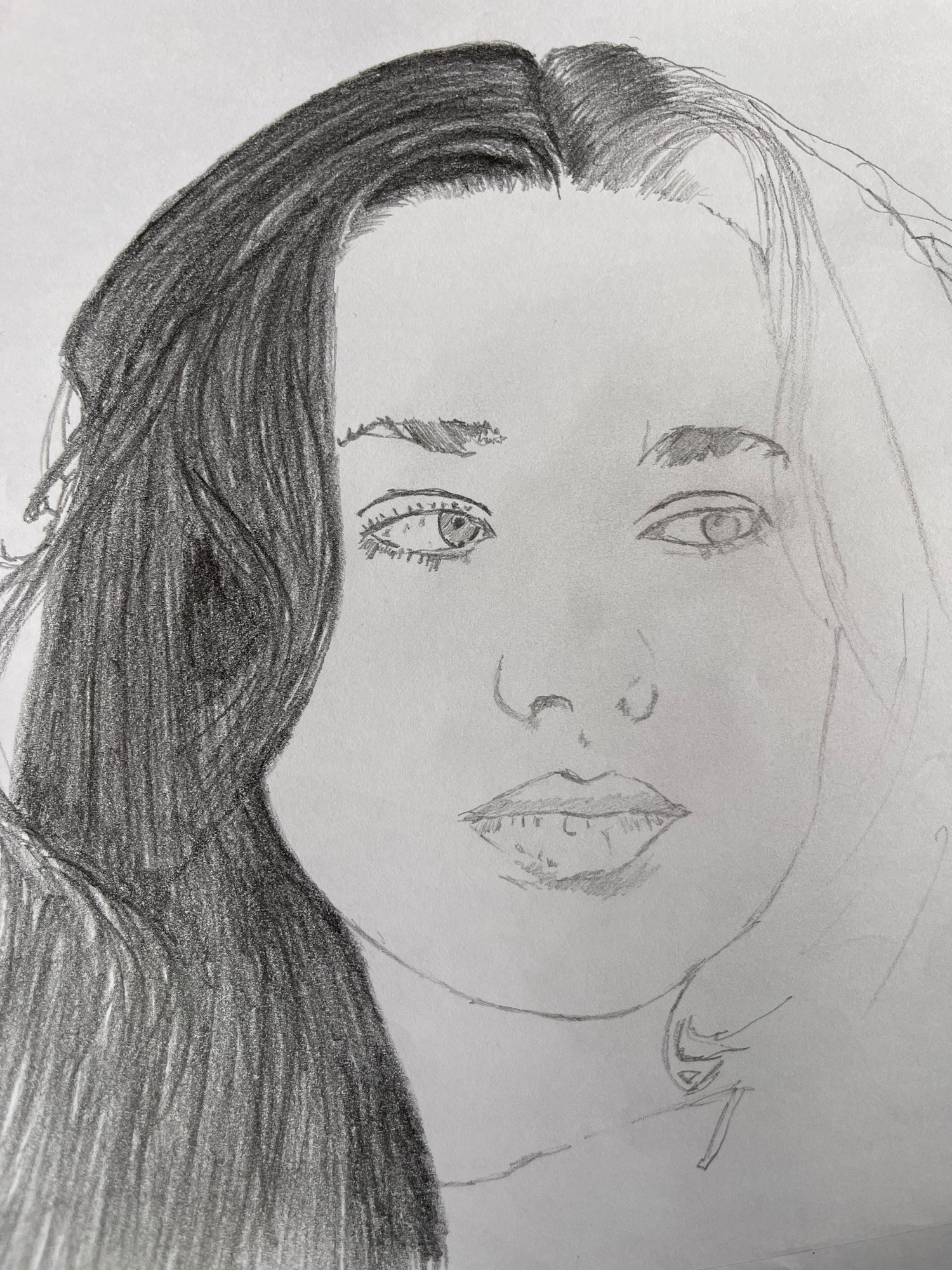 The image is a pencil drawing of a person's face, tilted slightly to the right. The face is largely unshaded except for the lips and around the eyes, which are somewhat detailed. The hair on the leftβ¦read more