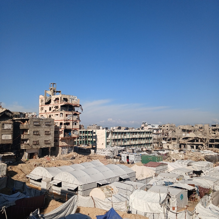 The image displays a densely populated, heavily damaged urban landscape in the city of Gaza, Palestinian Territory, under a clear blue sky with minimal cloud cover. In the background, numerous multi-s…read more