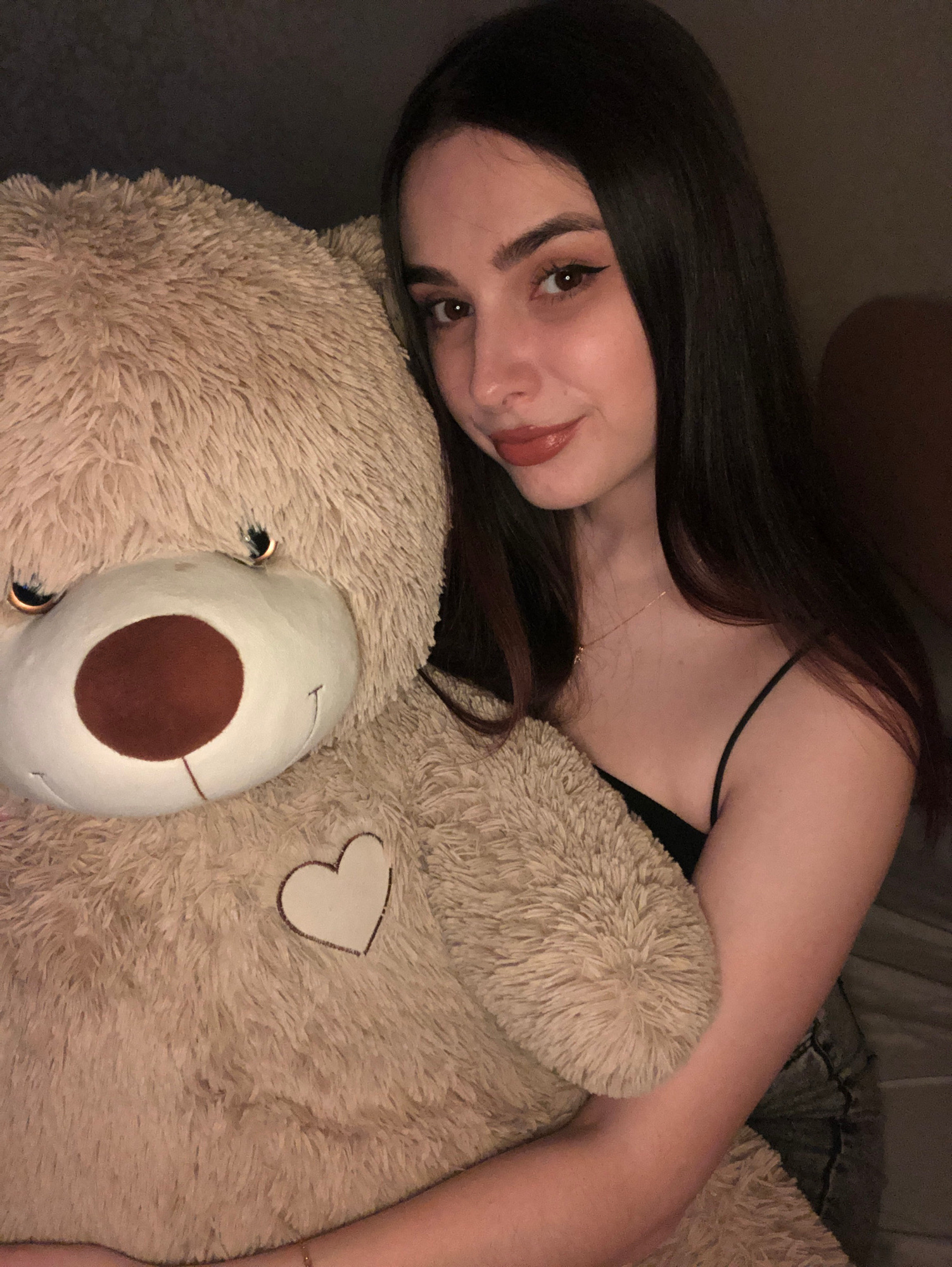 A young woman with long, dark hair and wearing a black tank top is lying on top of a large, light brown teddy bear. The teddy bear has a large white snout with a brown nose and small, dark eyes. A whi…read more