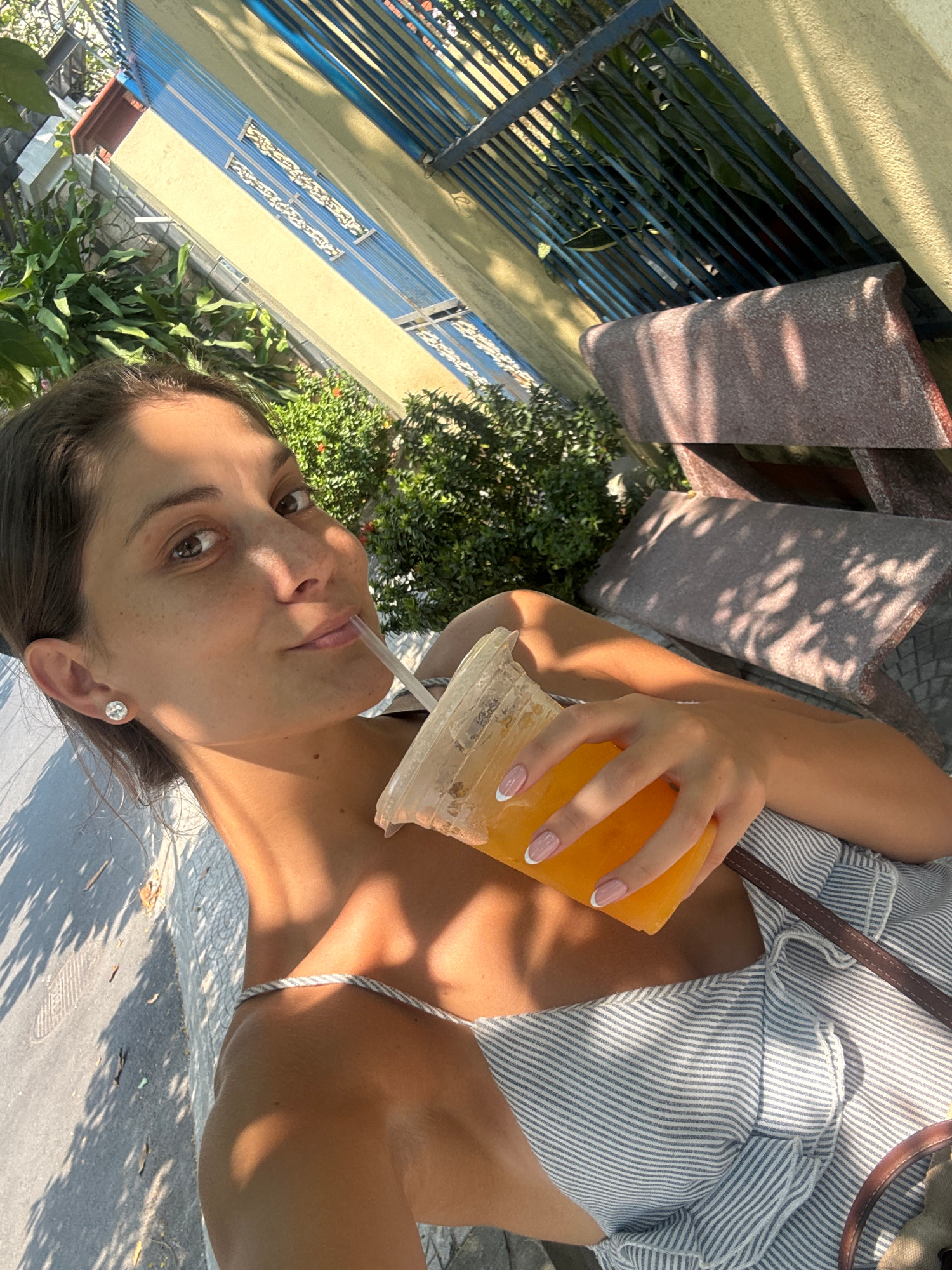 A young woman is holding a drink with a straw in a plastic cup. She is wearing a striped shirt and has a brown bag strap over her shoulder. She is wearing an earring in her left ear. The location is s…read more