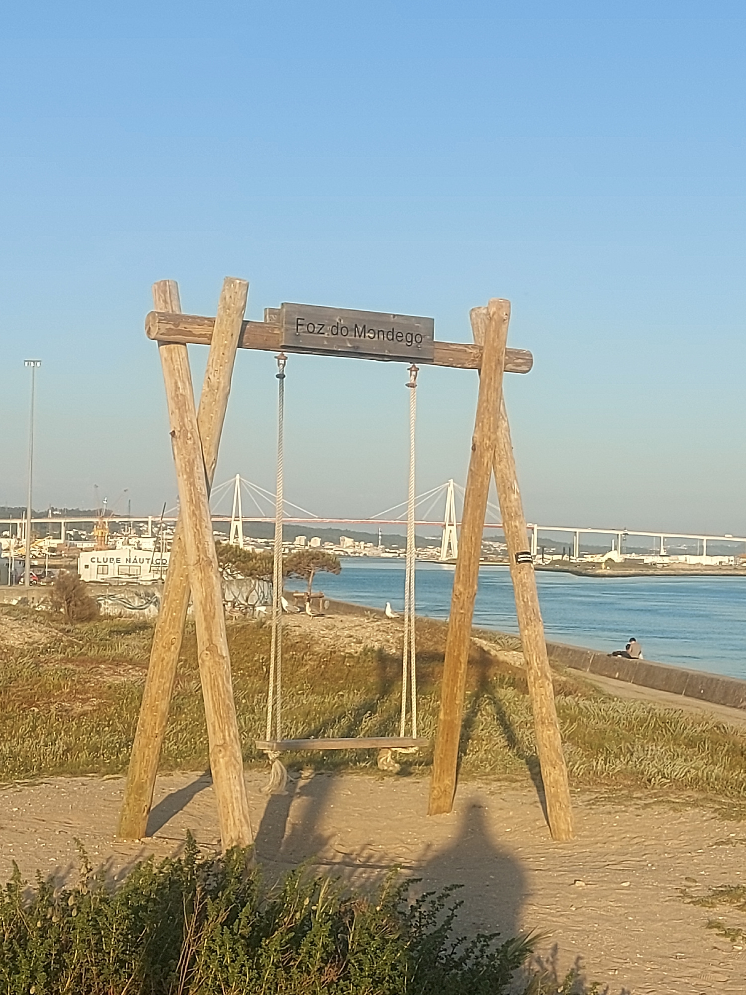 The image shows a wooden swing set with a sign that reads "Foz do Mondego." The swing set is located on a path near the Mondego River in Figueira da Foz, Portugal. In the background, a bridge spans th…read more