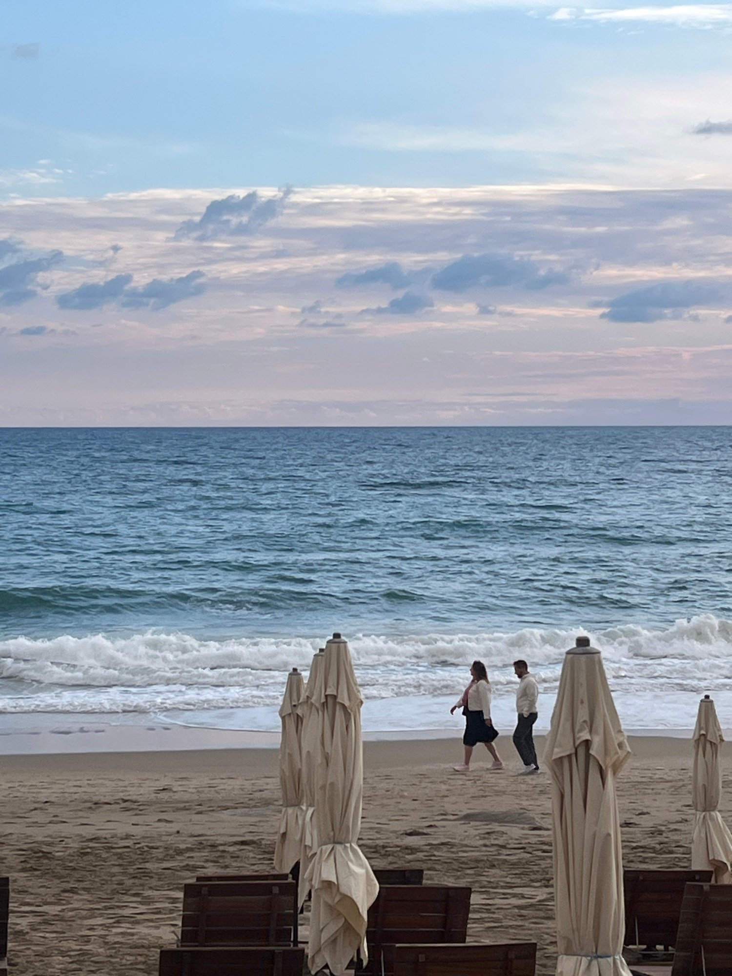 A medium-shot, portrait-oriented photograph depicts a beach scene with a sea, sky, sand, and several closed umbrellas with associated beach chairs. The umbrellas are rolled and tied, indicative of bei…read more