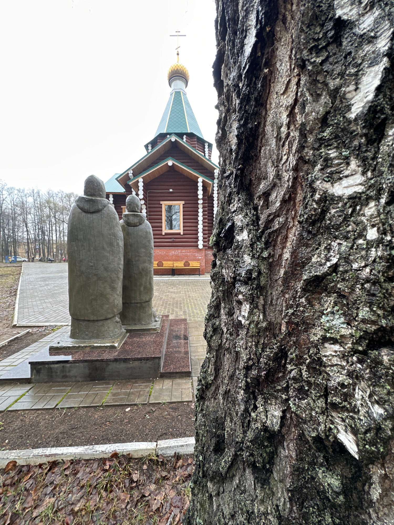 The image, viewed after being rotated 90 degrees clockwise, captures a serene religious scene in Chaikovsky, Russia, under an overcast sky. The immediate foreground is dominated by a large, textured s…read more