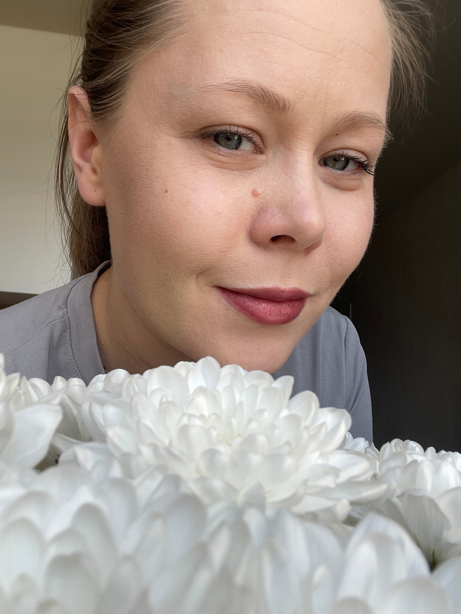 This media file features a close-up, tilted portrait of a young adult woman indoors, presenting a calm expression. She has fair skin, with light brown hair pulled back, visible on the sides. Her green…read more