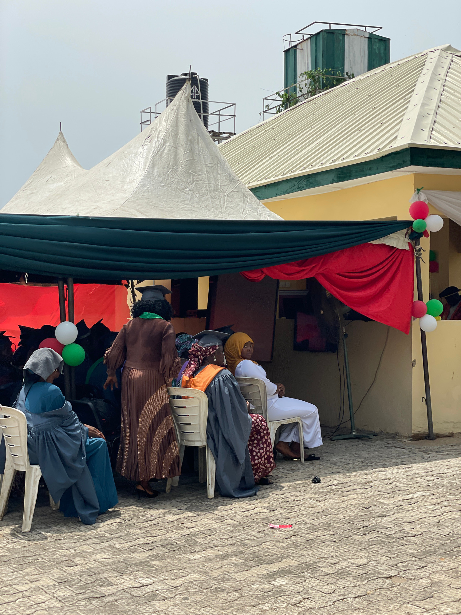 The image depicts an outdoor event in Lokoja, Nigeria. People are seated on white plastic chairs under a large white tent with green and red draping. Red, white, and green balloons are visible, sugges…read more