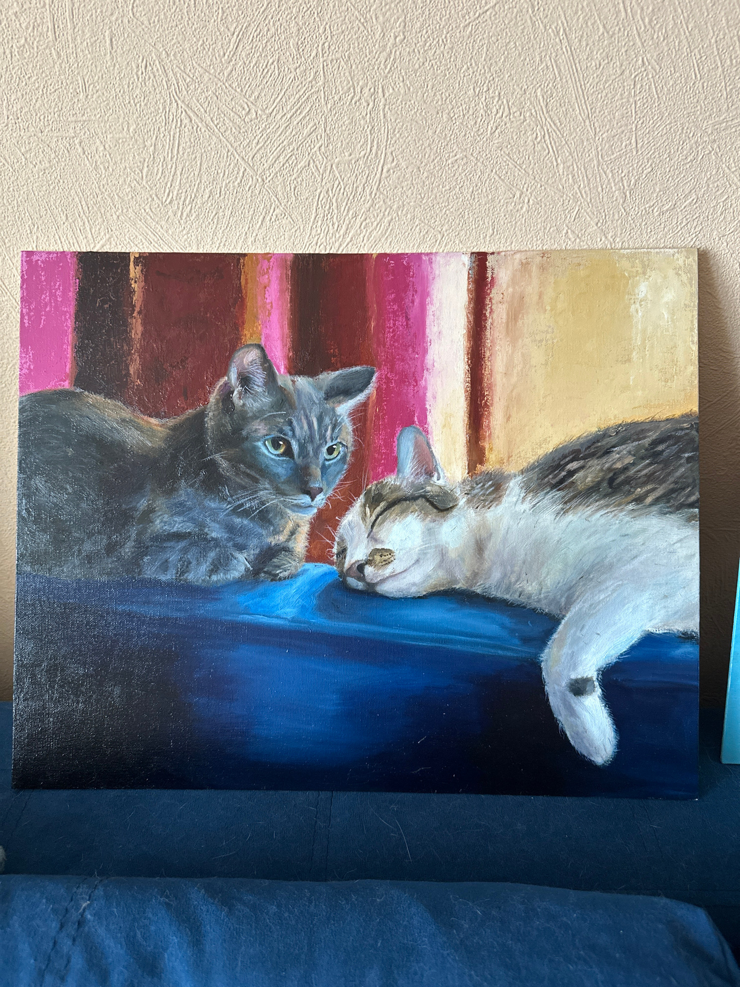 The image depicts an oil painting on canvas, propped against a beige textured wall and a blue fabric surface. The painting features two cats in an unusual, upside-down composition. The upper cat is a…read more