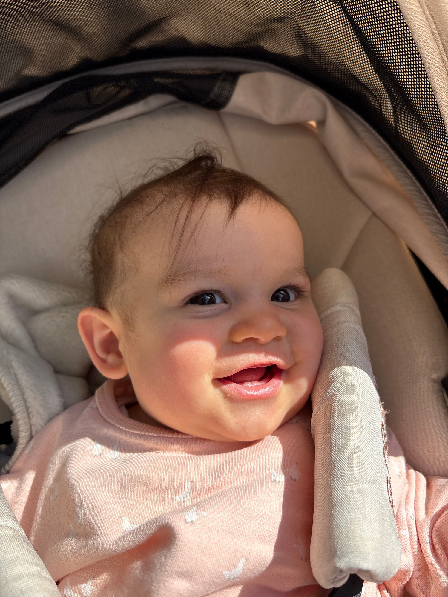 A baby lies on its back in a baby stroller, facing the camera, indoors. The baby is wearing a light pink shirt with a white pattern. A white fabric swaddle wraps around the baby's torso. The stroller…read more