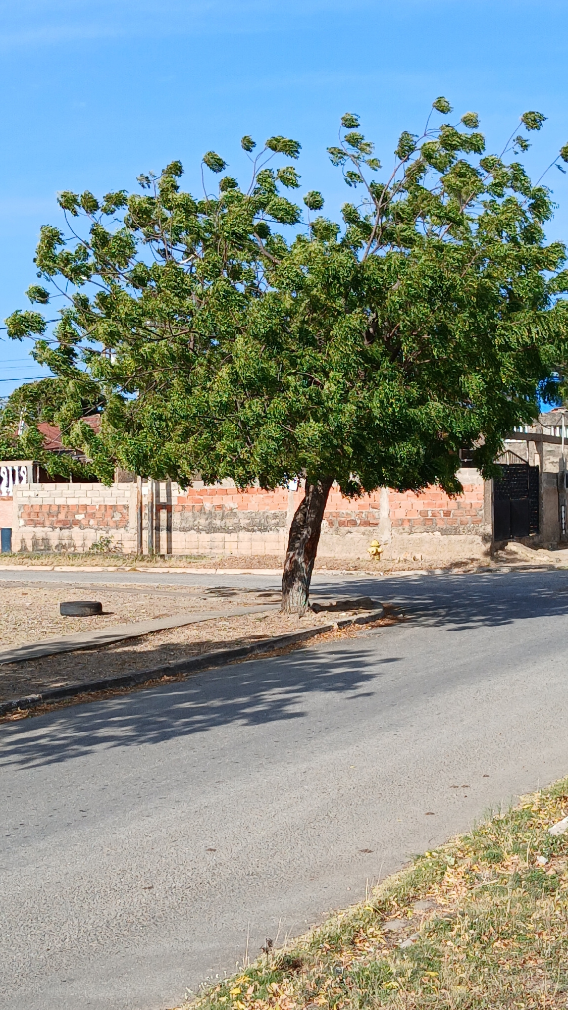 A daytime shot taken at street level in Juan Griego, Venezuela, features a tree with lush green foliage. The tree stands adjacent to a brick wall. The street is paved and runs alongside the wall. The…read more