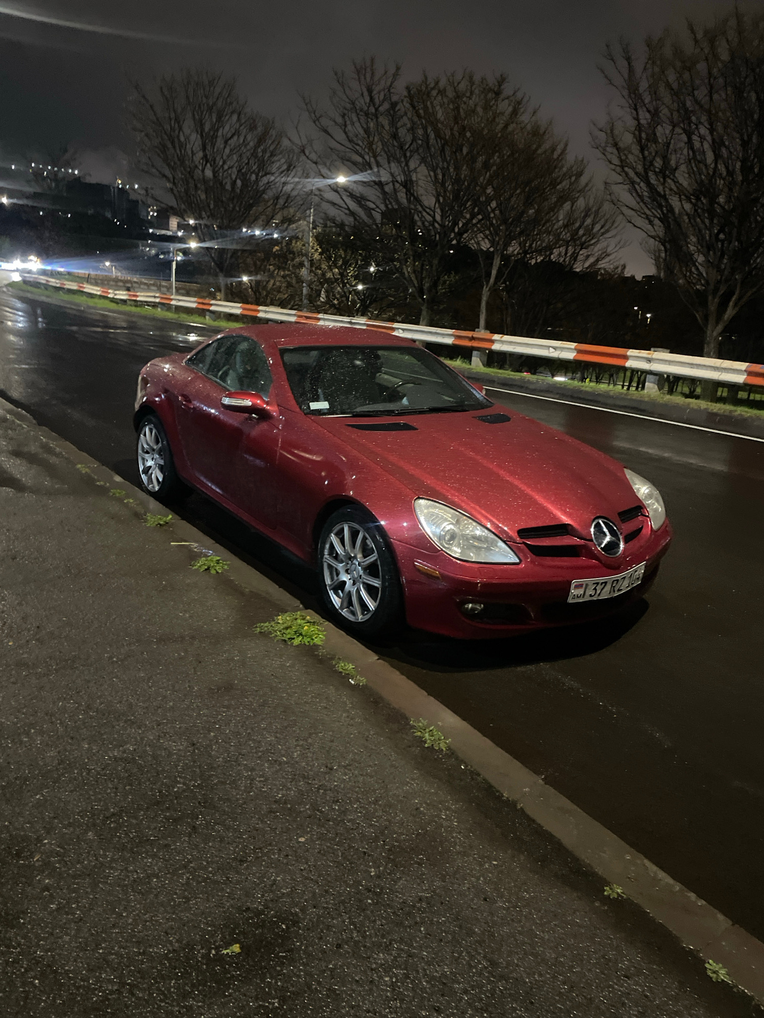 A red Mercedes-Benz SLK is parked on the right side of a wet Yerevan street at night. The car has Armenian license plate numbers beginning with "37 RZ." A concrete curb runs along the street's edge. B…read more