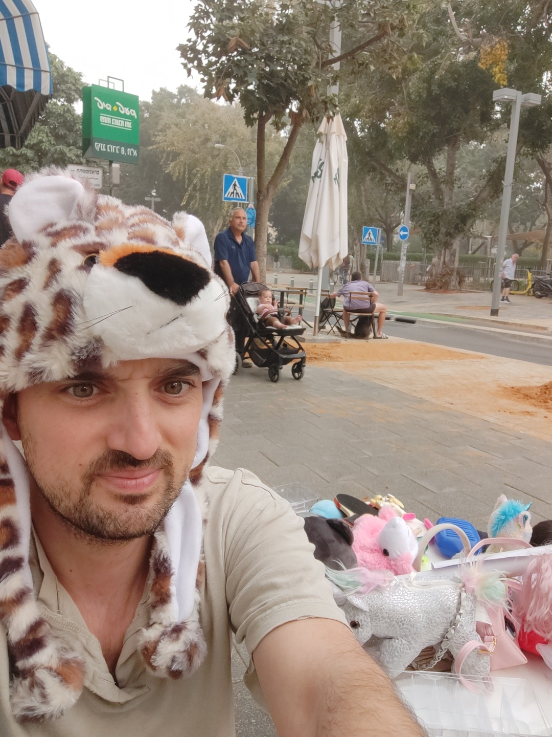 The image is a selfie of a man wearing a faux fur hat resembling a jaguar or similar big cat, with attached ears and a hood. The man is light-skinned with a dark beard and brown eyes. He is wearing a…read more