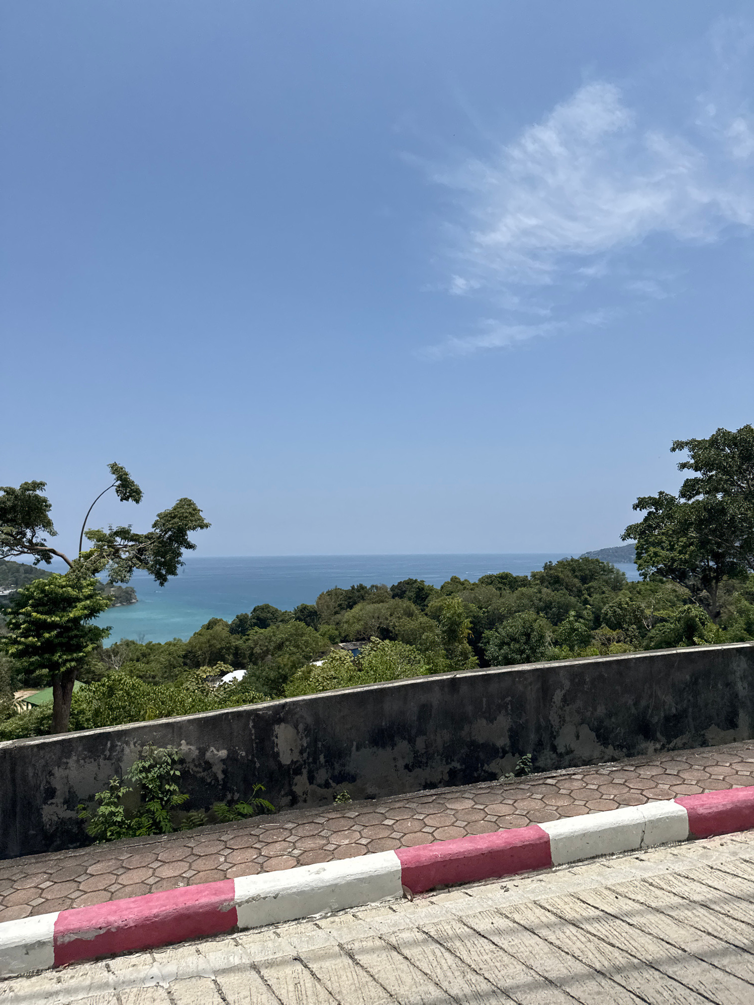 A vertically oriented, sunny day landscape photograph shows a view of the city of Patong, Thailand from a high vantage point. Predominantly visible is a clear blue sky with wispy clouds to the left, c…read more