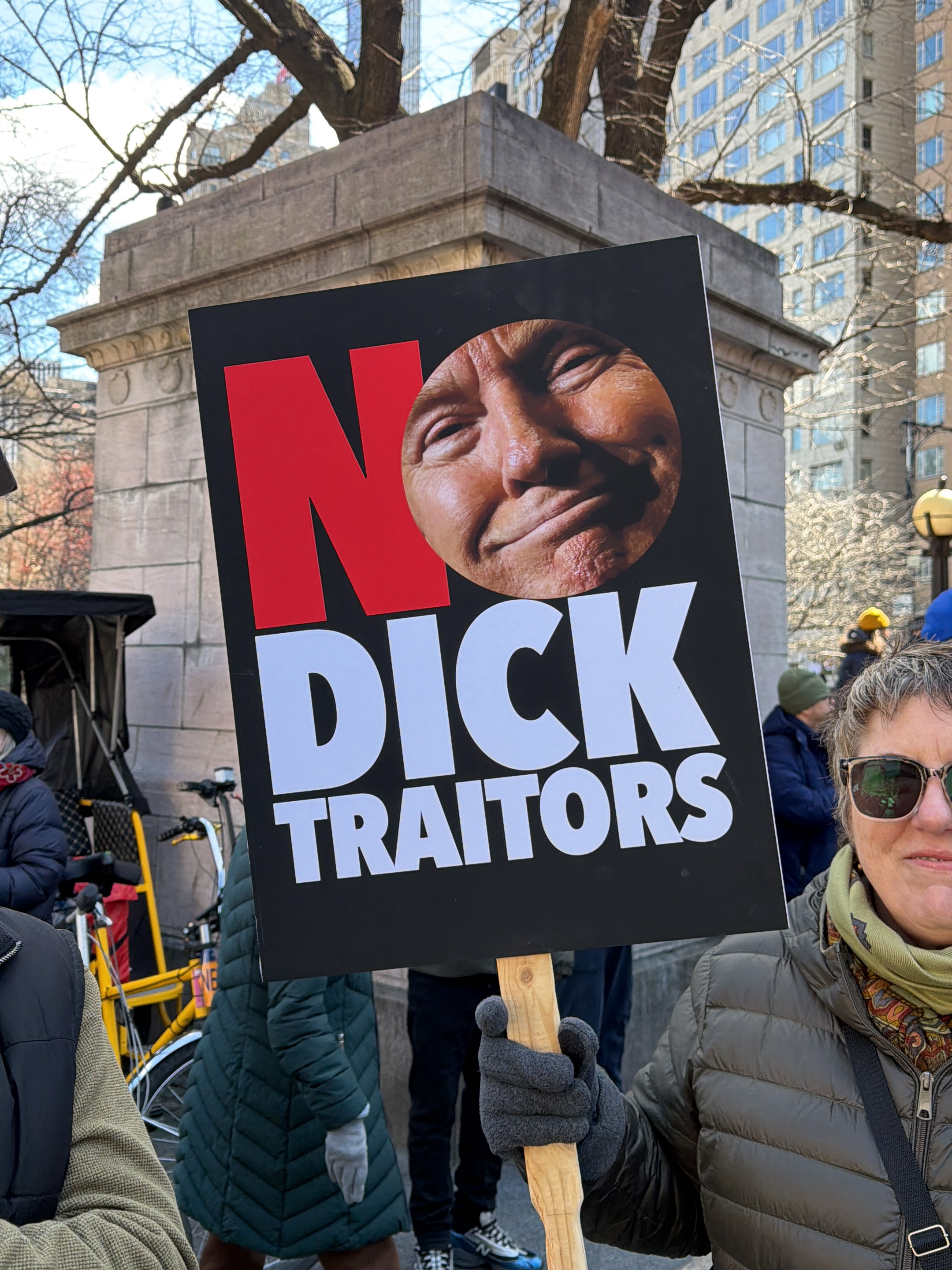 The image shows a political protest sign in New York City, United States. The sign is black with white text that reads "DICK TRAITORS" and a large red "NO" above. A photograph of Donald Trump's face i…read more