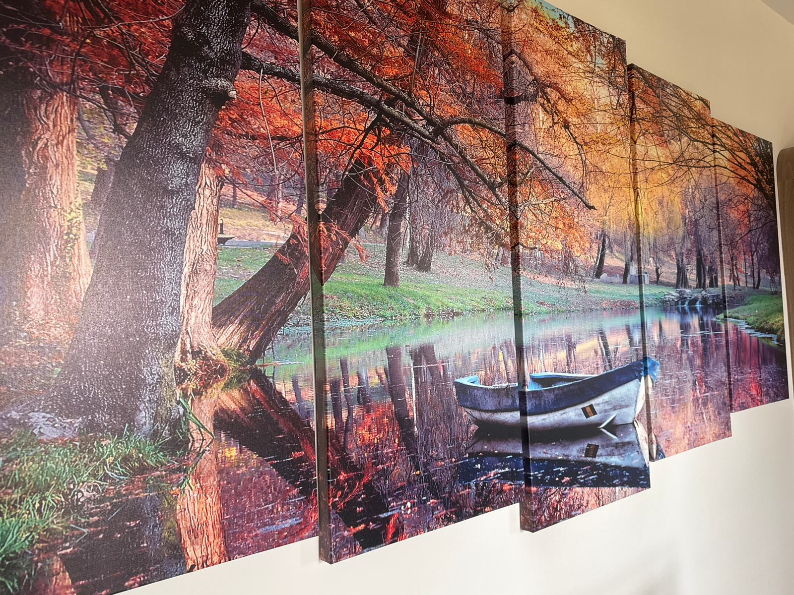 The image shows a multi-panel canvas print hanging on a white wall. The print depicts a tranquil waterscape scene. A small boat is centered in the water, surrounded by reflections of trees with autumn…read more