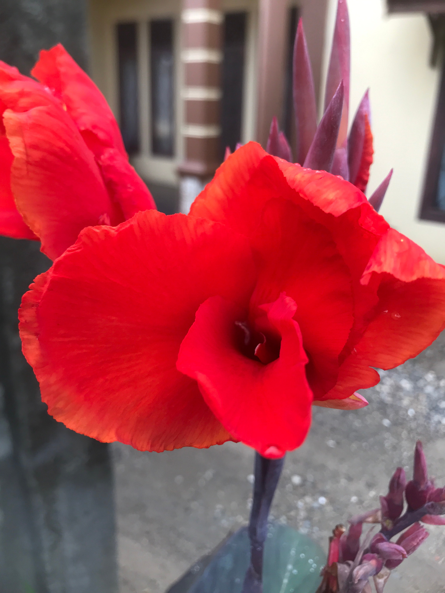 A close-up photograph shows a red canna lily in bloom, with several other unopened, pointed buds of the same plant visible in the background. The flower has large, ruffled petals and a deep center. Thβ¦read more