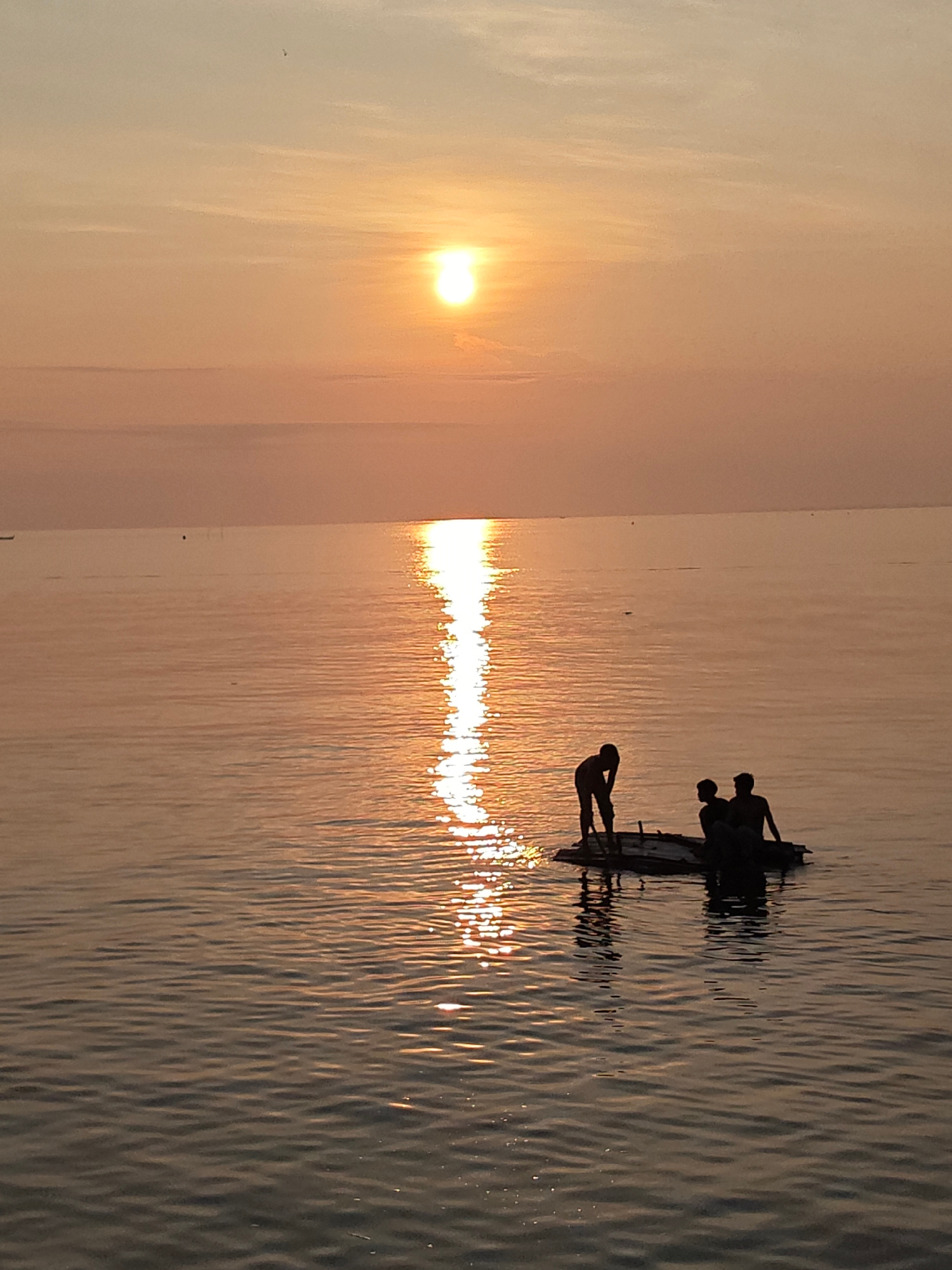 Three people are on a raft on the water. The sun is setting or rising. The city of Lhokseumawe, Indonesia, is not discernible in this image.