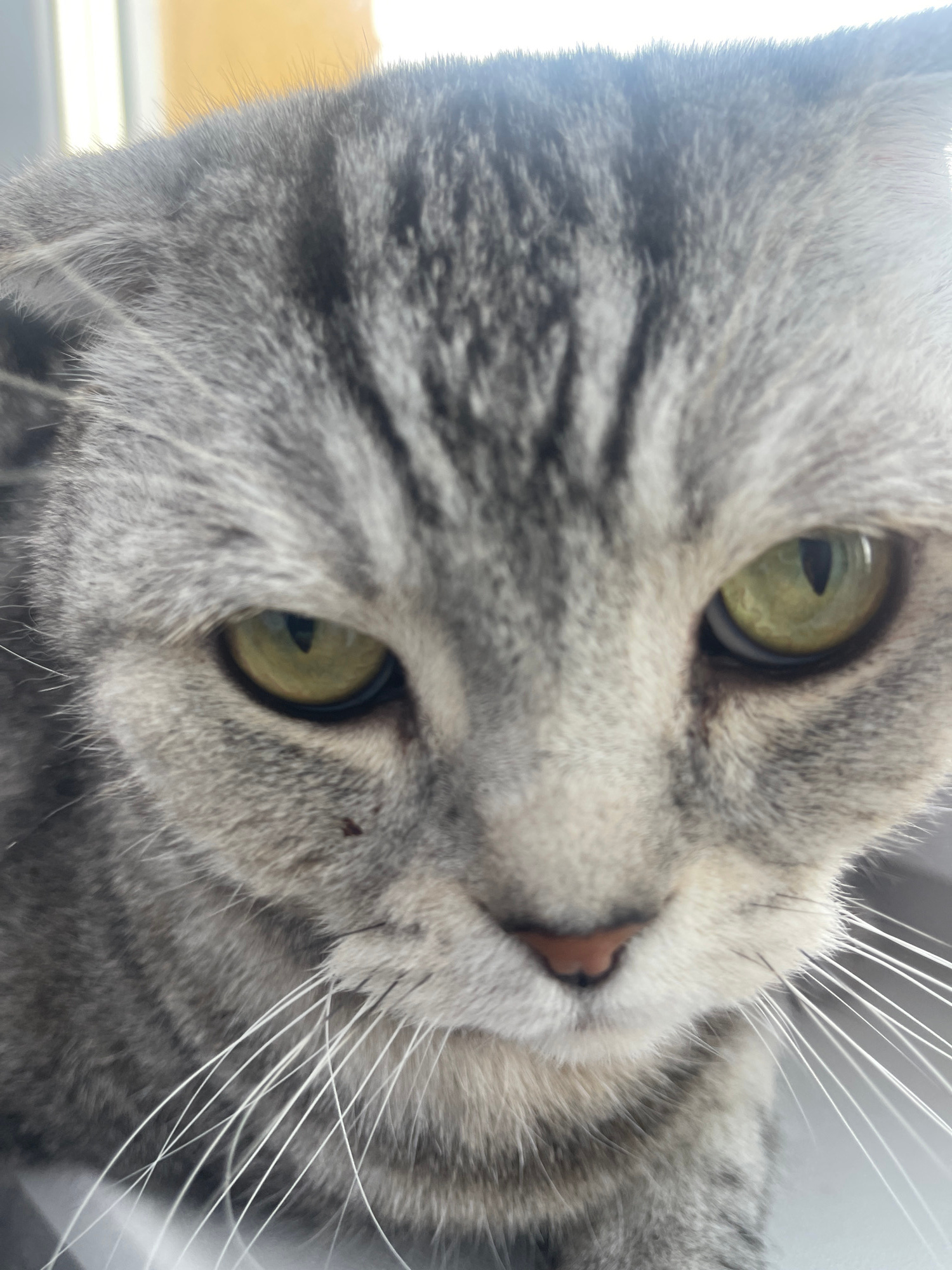 A close-up photograph shows the face of a gray tabby cat with green eyes, a pink nose, and white whiskers. The cat's fur is a mix of gray and white, with darker gray stripes. The photograph appears to…read more