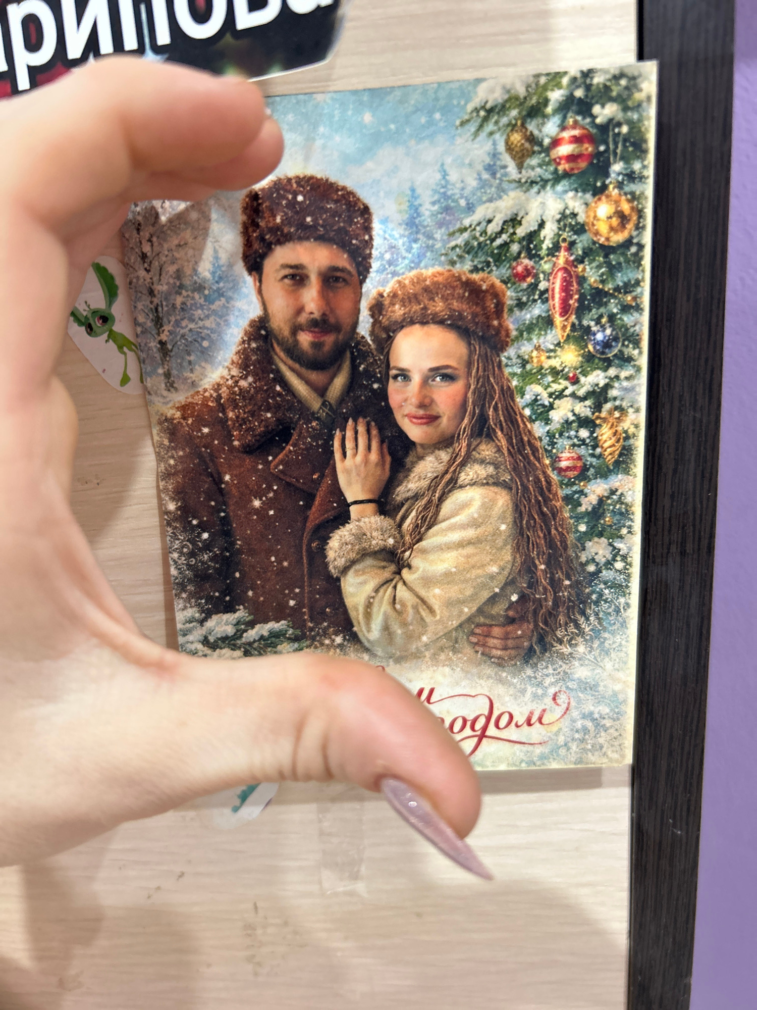 An image captures a human hand holding a rectangular postcard, magnet, or print featuring a festive winter illustration. The hand, with long, pointed, light-colored nails, holds the item over a light-…read more