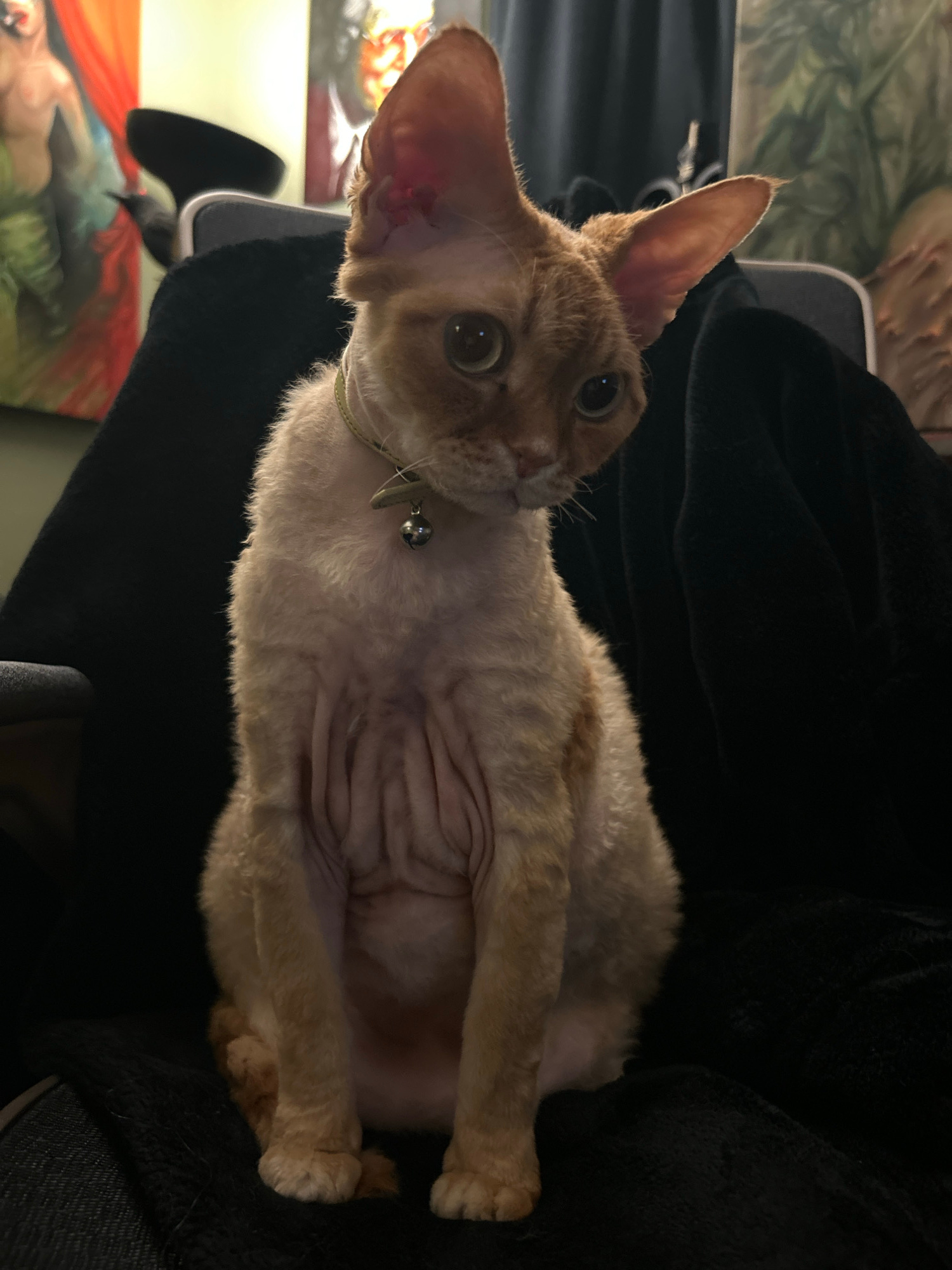 A light orange Devon Rex cat with a silver collar and bell is positioned on what appears to be a dark-colored chair or fabric surface. The cat is facing forward with its head tilted slightly to the le…read more